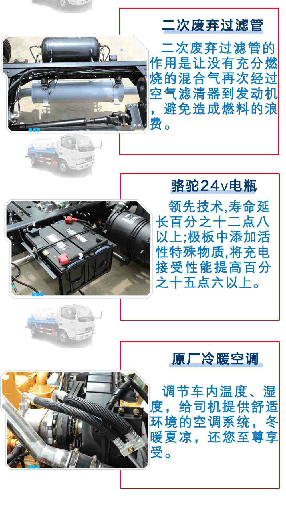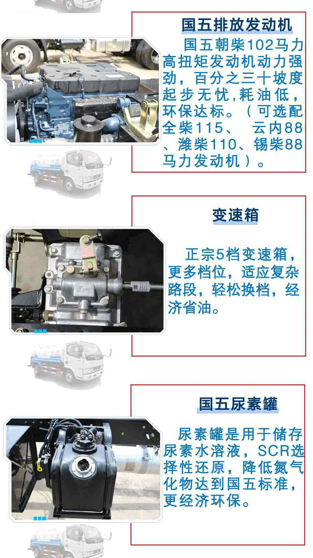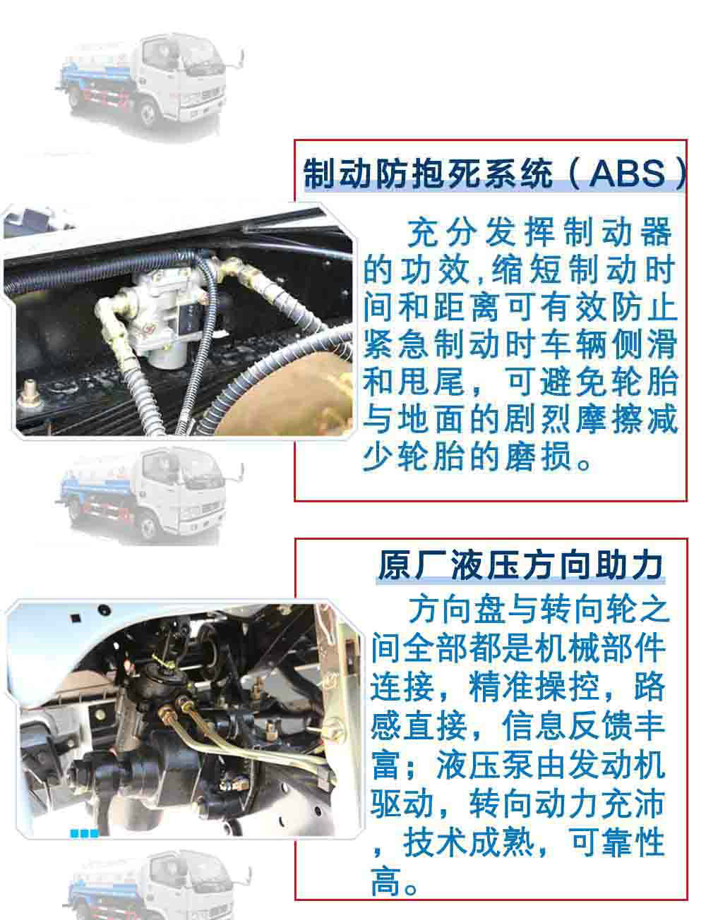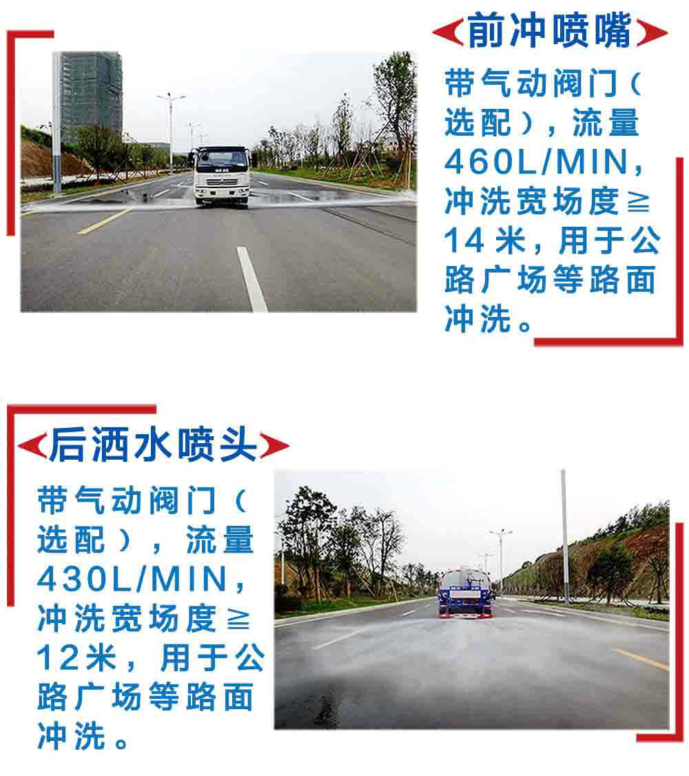 | 其他 | 1、隨底盤選裝駕駛室前面罩以及前霧燈。2、罐體有效容積:4.06立方米,罐體外形尺寸(長×長軸×短軸關系為(mm): 3400×1600×1100,僅選用3308軸距。3、側防護及后下部防護裝置均采用Q235A材質,均采用焊接連接,后下部防護尺寸:50×120(mm),離地面高度470mm。4、可選裝新款外觀及管路至于平臺下方。5、可選裝側防護及后下部防護裝置采用Q235B碳鋼,采用螺栓連接,后下部防護尺寸:50×120(mm),離地面高度450mm。6、文字噴圖位置、車輛顏色及局部細節可變化。7、ABS廠家及型號:襄陽東風隆誠機械有限責任公司/ABS/ASR-24V-4S/4M;8、選裝前沖專用裝置位于駕駛室和罐體之間。9、專用裝置:罐體,主要用于灑水及園林綠化。 | ||