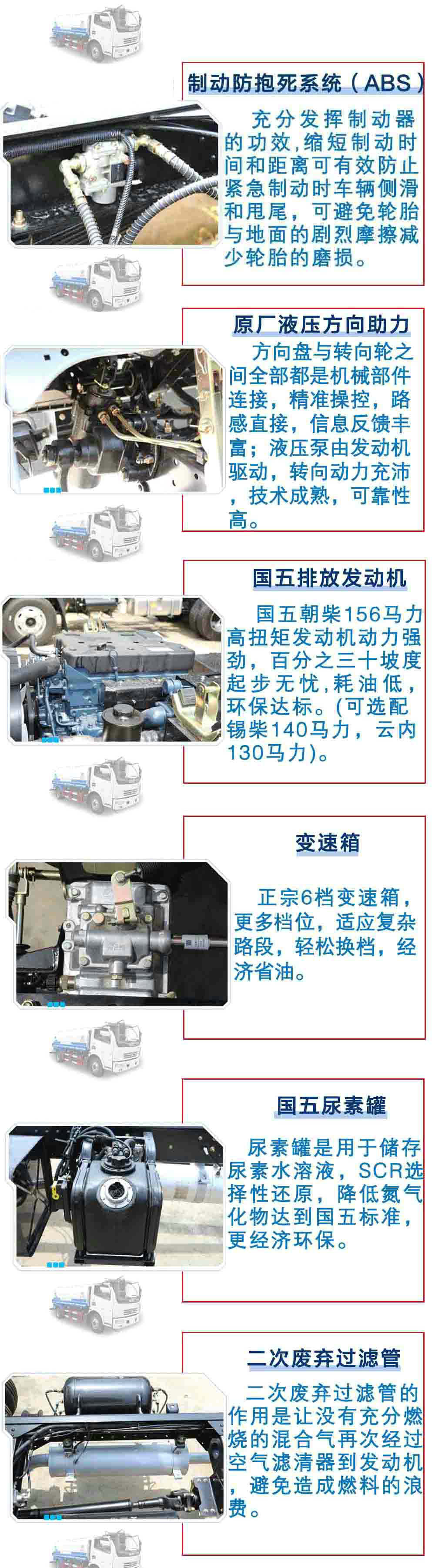 | 其他 | 1、運輸介質(zhì): 水,介質(zhì)密度:1000千克/立方米,罐體有效容積:6.82立方米,罐體外形尺寸(長×長軸×短軸)為(mm):4200×1900×1250;2、側(cè)防護(hù)及后下部防護(hù)裝置均采用Q235A材質(zhì),均采用焊接連接, 后部防護(hù)斷面尺寸(mm):120×50,后部防護(hù)離地高度(mm):470。3、ABS型號:ABS/ASR-24V-4S/4M,廠家:襄陽東風(fēng)隆誠機(jī)械有限責(zé)任公司。4、文字噴圖位置和車輛顏色可變化。5、隨底盤選裝駕駛室。 | ||