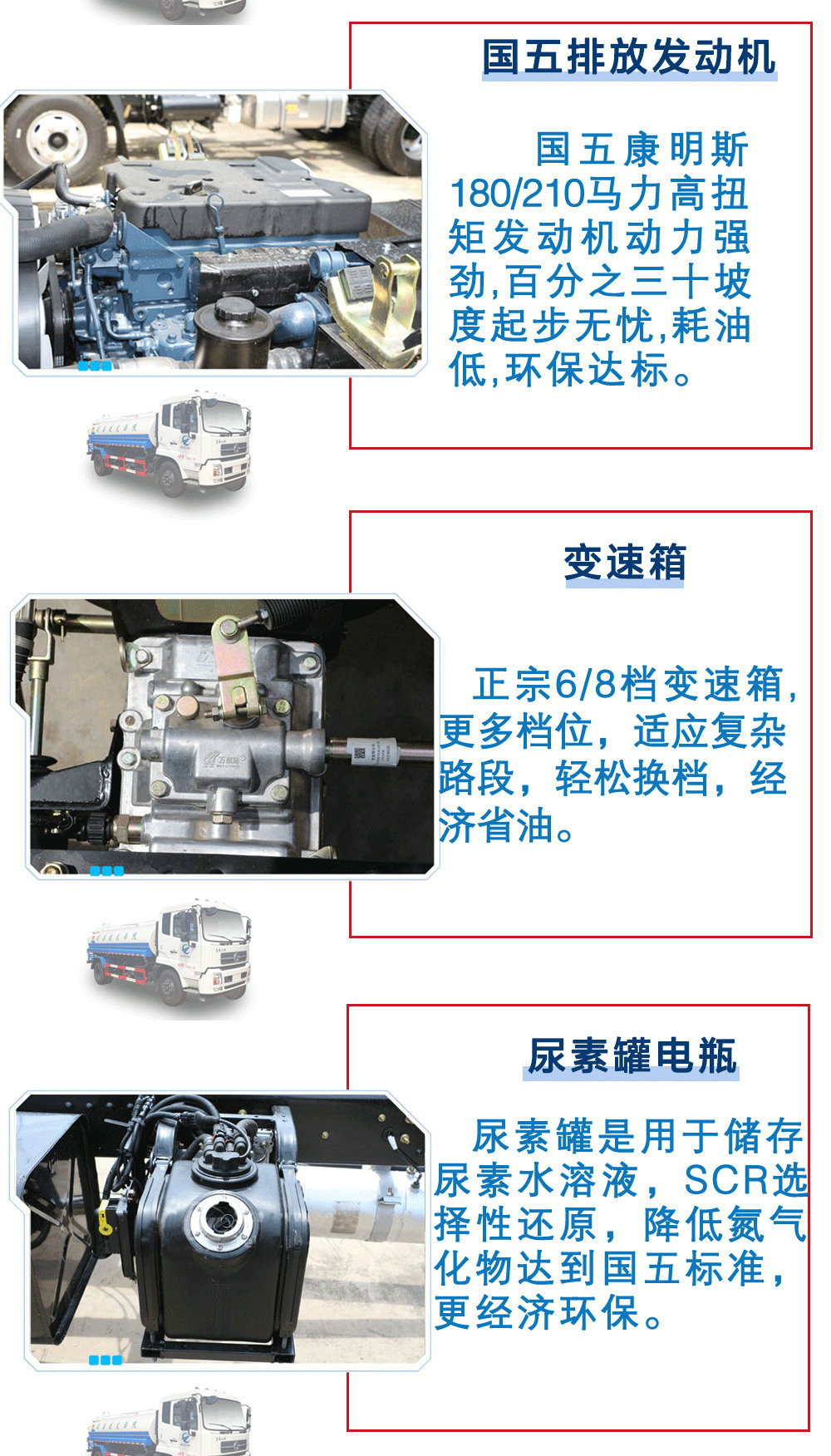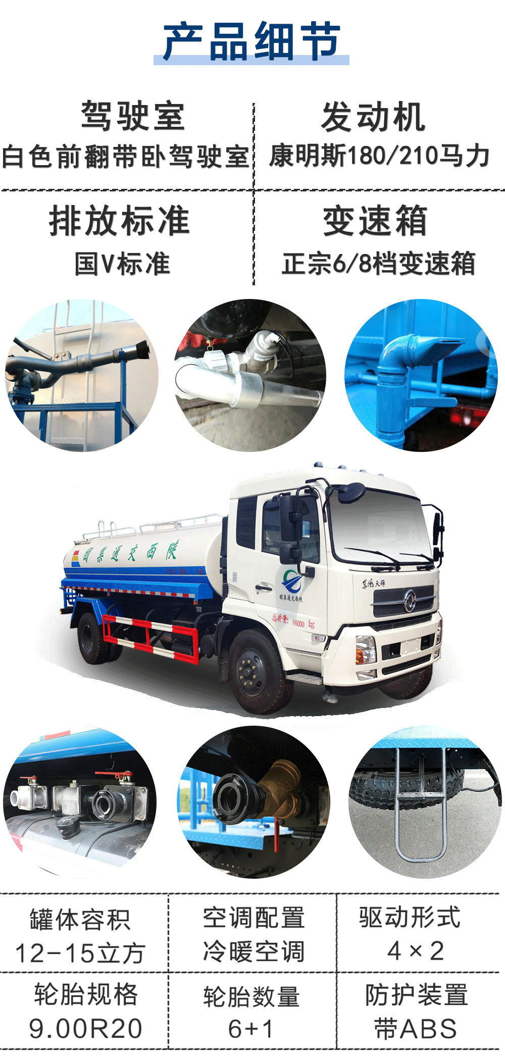 | 其他 | 1.,運輸介質:水,密度:1000千克/立方米,罐體有效容積:9.24立方米;帶后操作平臺時,整車長度/軸距/后懸/離去角/罐體外形尺寸(長×長軸×短軸)的對應關系為(mm): 8400/4700/2270/13/5000×2000×1360; 8200/4500/2270/13/5000×2000×1360; 8200/4500/2270/13/4500×2160×1400; 7900/4200/2270/13/4500×2160×1400。 2. 選裝不帶后操作平臺時,整車長度/軸距/后懸/離去角/罐體外形尺寸 (長×長軸×短軸)的對應關系為(mm): 8000/4700/1870/15/5000×2000×1360; 7800/4500/1870/15/5000×2000×1360; 7800/4500/1870/15/4500×2160×1400; 7500/4200/1870/15/4500×2160×1400。 3. 當選裝后操作平臺時可選裝噴霧機組。4.側防護及后下部防護裝置均采用Q235A材質,均采用焊接連接,后下部防護尺寸:150×50(mm),離地面高度500mm。5. ABS型號:3631010-C2000,4460046440;生產廠家:東科克諾爾商用車制動系統(十堰)有限公司,威伯科汽車控制系統(中國)有限公司。6. 罐體可選裝橢圓罐體,車輛文字噴圖位置、顏色及局部細節可變化。7.隨底盤選裝駕駛室。 | ||
