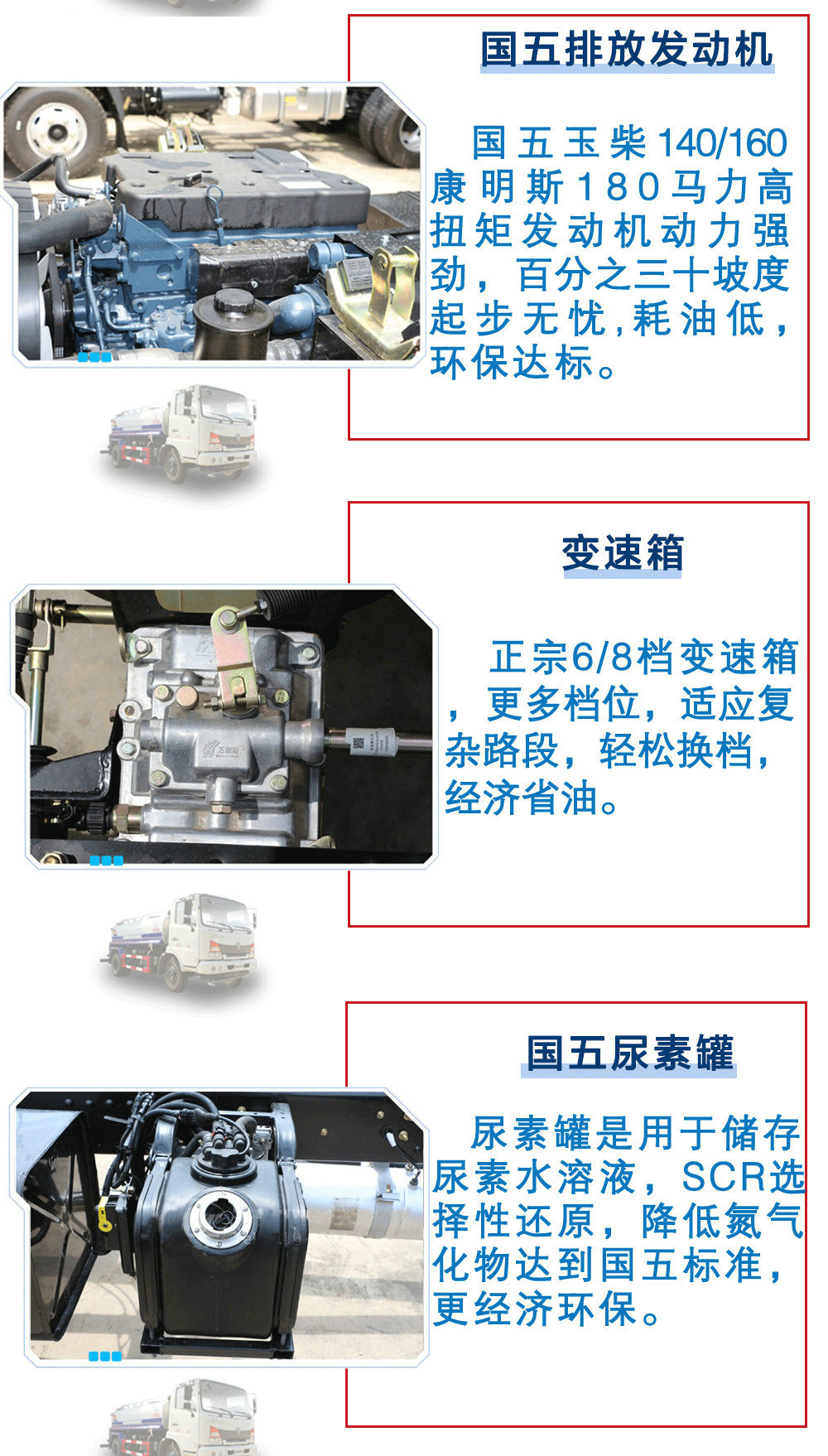| 其他 | 1.罐體有效容積:10.39立方米,罐體外形尺寸(長×長軸×短軸)/軸距的對應關系為(mm):(5000×2250×1350)/4700;(5000×2250×1350)/4500;(4600×2300×1450)/4200;(4600×2300×1450)/3950;整車長/前懸/軸距/軸距的對應關系為(mm):8600/1445/4700/2455;8400/1250/4700/2450;8400/1445/4500/2455;8200/1250/4500/2450;8100/1445/4200/2455;7900/1250/4200/2450;7850/1445/3950/2455;7650/1250/3950/2450。2、軸距變化引起的質量變化在3%以內,可忽略不計。3、側防護及后下部防護裝置均采用Q235A材質,均采用焊接連接,后下部防護尺寸:150×50(mm),離地面高度510mm。4、ABS生產廠家;東科克諾爾商用車制動系統(十堰)有限公司,型號:3631010-C2000。5、隨底盤選裝駕駛室。6、專用裝置:罐體,主要用于灑水及園林綠化。 | ||