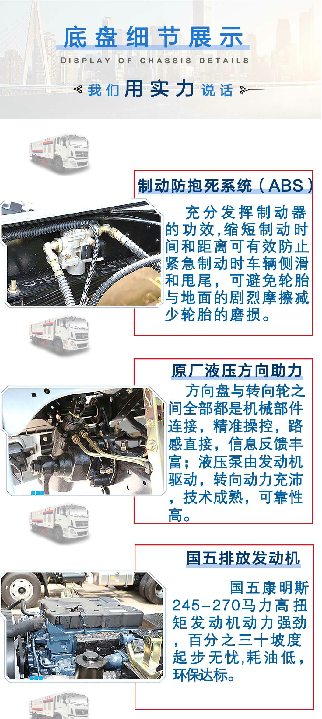 | 其他 | 隨底盤選裝駕駛室.防護(hù)材料:Q235A碳鋼,連接方式:左右側(cè)面防護(hù)與專用裝置(掃刷)相干涉故豁免,后下部防護(hù)與副梁車架采用螺栓連接,后部防護(hù)斷面尺寸(mm):170×50,后部防護(hù)離地高度(mm):450.ABS生產(chǎn)廠家:東科克諾爾商用車制動(dòng)系統(tǒng)(十堰)有限公司;型號(hào):3631010-C2000.整車長/前懸/軸距/后懸對(duì)應(yīng)關(guān)系為(mm):10700=1480+5700+1350+2170;10500+=1480+5350+1350+2320;10050=1480+4350+1350+2870;9620=1480+3800+1350+2990;10700=1500+5700+1350+2150;10500=1500+5350+1350+2300;10050=1500+4350+1350+2850;9620=1500+3800+1350+2970. | ||