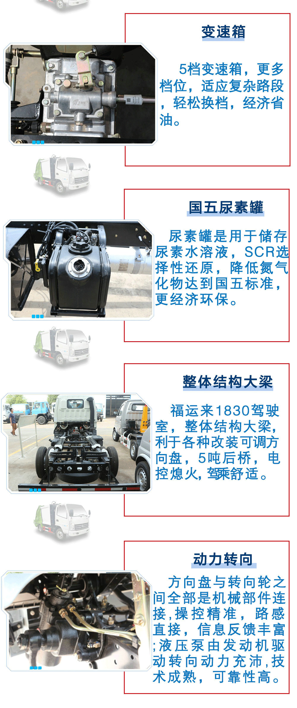 | 其他 | 1,僅選用2800mm軸距底盤,額定載質量(kg)/駕駛室準乘人數(人)的對應關系為:165/2,100/3。2,防護材料:Q235A碳鋼,連接方式:左右側面防護均采用焊接連接在箱體底面上,后部防護由專用裝置代替豁免,最小離地高度為410mm。3,ABS型號:CM4XL-4S/4K(4S/4M),ABS生產企業:廣州市科密汽車制動技術開發有限公司.4,車輛顏色,文字噴涂位置可變化。5,僅采用發動機與油耗值對應關系為(L/100km):WP2.1Q82E50/12.35,D19TCIE1/12.19,YN27CRE1/12.25,SD4D25R-70/12.56,4DW93-84E5 /12.55,YCD4N4S-110/12.19,WP2.3Q110E50/12.40。6,專用裝置:廂體,主要用于城鎮環衛垃圾的收集與運輸。 | ||