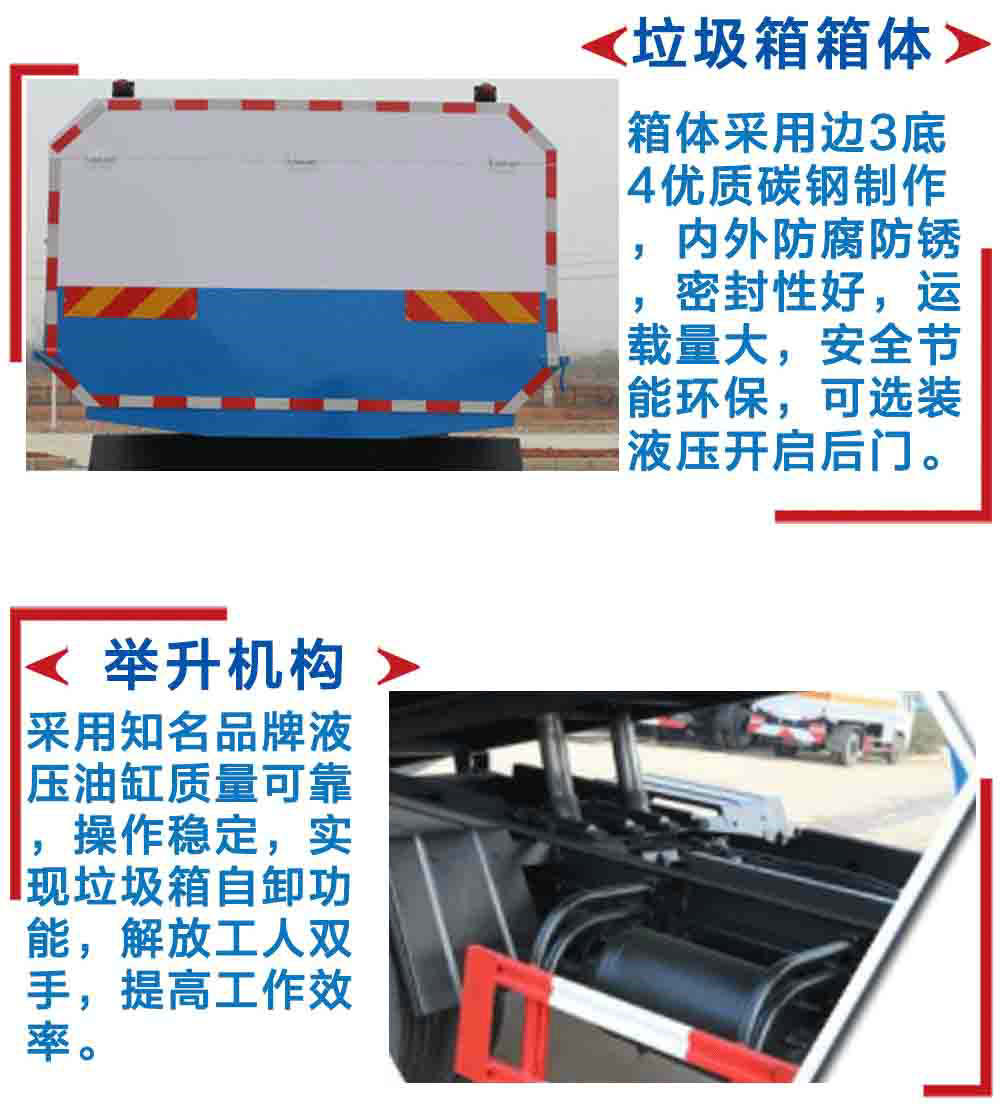 | 其他 | 自卸方式:后卸式。隨底盤選裝駕駛室。選裝掛鐵桶裝置。防護材料:Q235A碳鋼,連接方式:左右側面及后下部防護均采用焊接連接,后下部防護斷面尺寸(mm):100×50,后下部防護離地高度(mm):450。ABS型號為3631010-C2000,生產廠家為東科克諾爾商用車制動系統(十堰)有限公司。 | ||