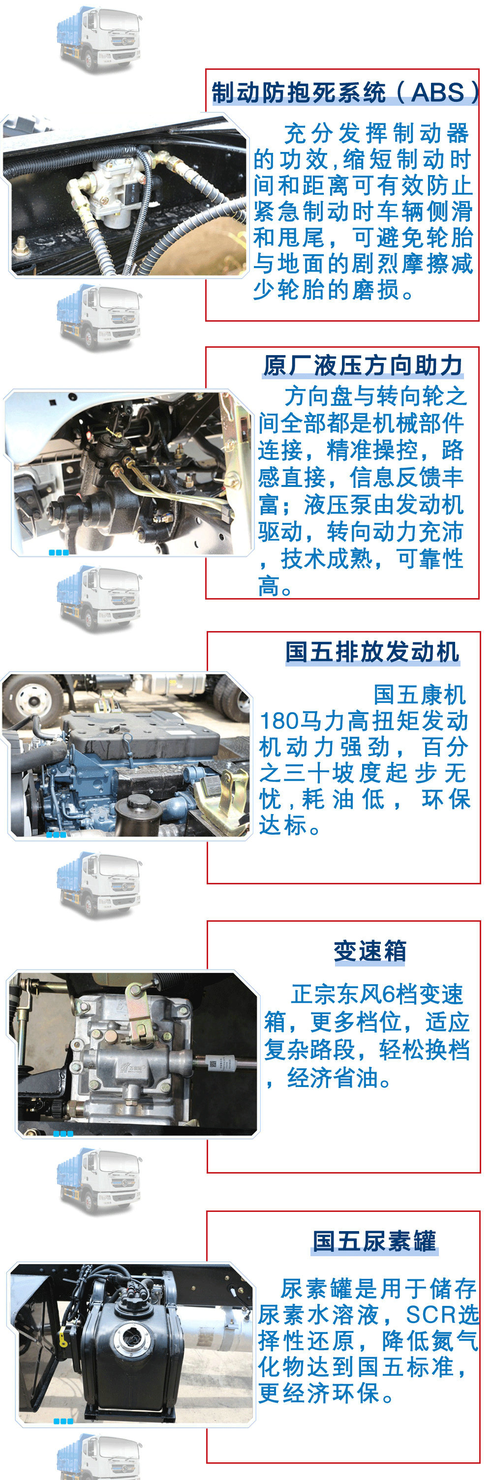 | 其他 | 1、防護材料:Q235A碳鋼,連接方式:左右側面防護與副梁采用焊接連接,后下部防護與車架采用焊接連接,后部防護斷面尺寸(mm):120×50,后部防護離地高度(mm):500。2、ABS系統(tǒng)生產廠家,型號 :焦作博瑞克控制技術有限公司,JABS。3、選裝上裝外觀形式,文字噴涂位置和車輛顏色可變化。4、整車尺寸與軸距對應關系為(mm):7750/4500,7200/3950。5、發(fā)動機與油耗值對應關系為(L/km):YC4EG170-50/26.0,YC4EG185-50/26.3,ISB180 50/27.8,ISD160 50/26.3。6、選裝車輛側面及后部外觀樣式。7、專用裝置名稱:箱體,主要用于城鎮(zhèn)環(huán)衛(wèi)壓縮站垃圾的轉運。8、隨底盤選裝駕駛室。 | ||