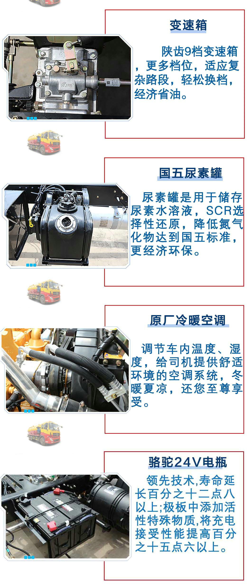 | 其他 | 1、運輸介質:液態污物,密度:800千克/立方米,罐體有效容積:15.48立方米;罐體尺寸(直段長×直徑)(mm)為:5500×2000;2、文字噴涂位置和車輛顏色可變化,隨底盤選裝駕駛室。3、防護材料:Q235A碳鋼,連接方式:左右側面與大梁采用焊接連接,后下部防護均采用焊接連接,后部防護斷面尺寸(mm):150×50,后部防護離地高度(mm):480。4、 ABS生產廠家:東科克諾爾商用車制動系統(十堰)有限公司;型號:3631010-C2000。 | ||