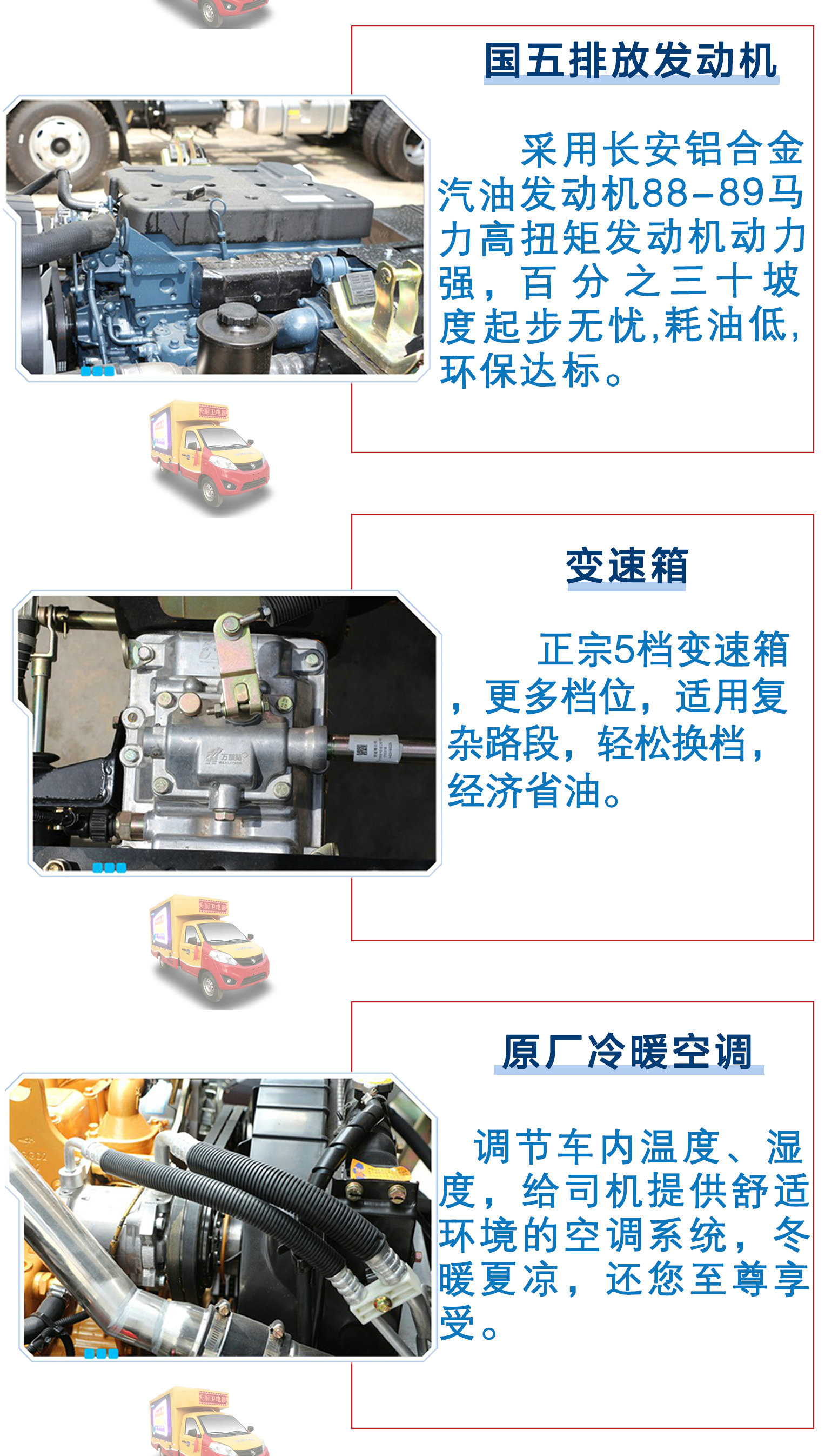 | 其他 | 貨箱頂部封閉不可開啟.選裝不帶側開門貨廂形式.選裝新前圍.選裝前格柵顏色和霧燈底座顏色.發動機LJ469Q-1AE9對應油耗值為8.0,發動機4W12M1對應油耗值為7.6,發動機DAM15R對應油耗值為8.9.選裝同等功率制冷機組,可選裝ABS,ABS型號為YF9,生產企業為武漢元豐汽車電控系統有限公司. | ||