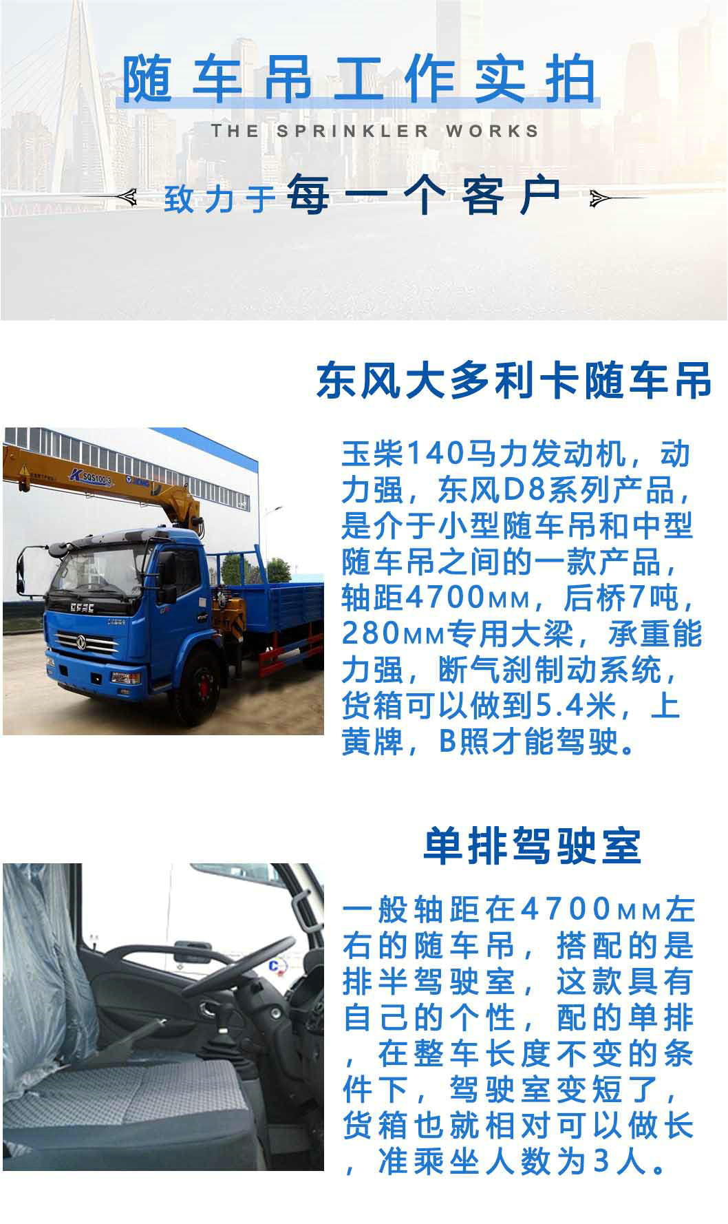 隨車吊采用國內知名吊機及液壓泵系統,可根據用戶需求選用不同長度、噸位的貨廂或吊機。具備功率大,車速高、爬坡能力強,起升高度高,作業范圍大。可實現快速升降,高效、節能。具有機動靈活、方便高效、安全可靠等優點。