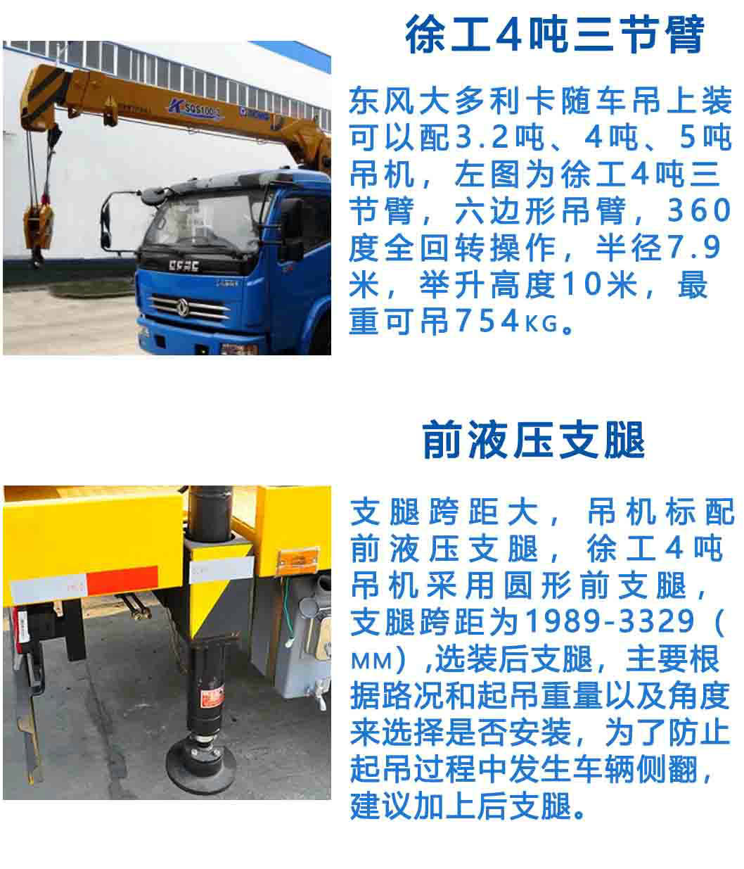 采用新型H型支腿,各支腿可單獨調節以調整車架水平,支腿跨距大,整機穩定性好。隨車吊機可選擇直臂或折臂,吊機品牌可選擇徐工、三一帕爾菲格、石煤、長興、程力、新飛工等。有2噸、3.2噸、4噸、5噸、6.3噸、8噸、10噸、12噸、16噸、18噸吊機可選擇,可選用2節臂或3節臂或4節臂,廣泛運用于各種裝卸、安裝起重作業,尤其適用于野外起重、救險作業和車站、港口、倉庫、建筑工地、礦山等狹窄場所作業。