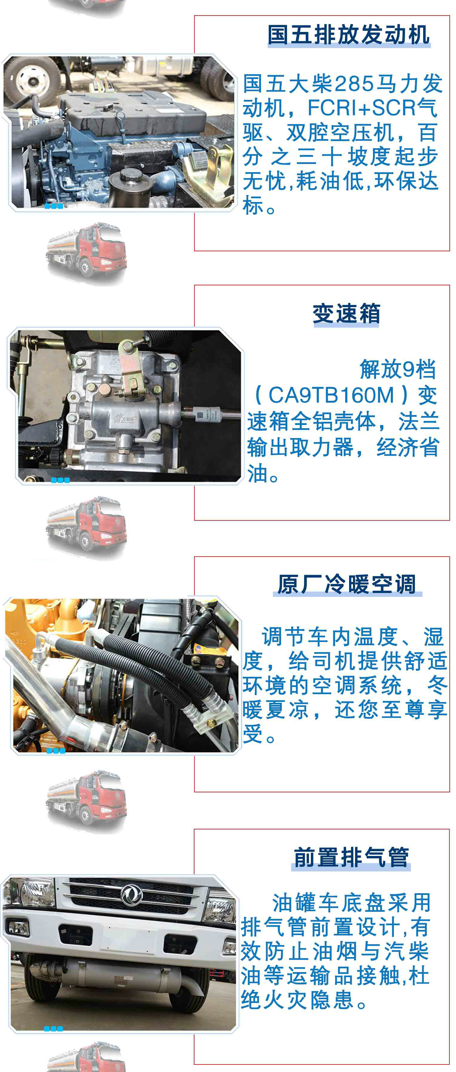 | 其他 | 該車適用于危險品運輸,運輸介質:汽油,煤油,柴油。介質密度分別為:0.7噸/立方米, 0.8噸/立方米, 0.83噸/立方米。類項號:3;罐體有效容積:25.73立方米, 罐體外形尺寸(長×長軸×短軸)(mm)為:8500×2250×1650。防護材料:Q235A碳鋼,連接方式:左右側面及后下部防護均采用焊接連接,后部防護斷面尺寸(mm):135×50,后部防護離地高度(mm):480。僅采用底盤子午線輪胎和帶ABS的底盤; 該車前輪安裝盤式制動器,裝配限速裝置,限速79km/h。安裝帶有衛星定位功能的行駛記錄儀。ABS系統生產廠家:浙江萬安科技股份有限公司,型號:VIE ABS-Ⅱ。油耗對應關系:38.89(CA6DK1-28E5),罐體顏色和文字噴涂位置可變化。選裝平頂駕駛室。選裝不帶走臺。選裝輕型擋泥板樣式。 | ||