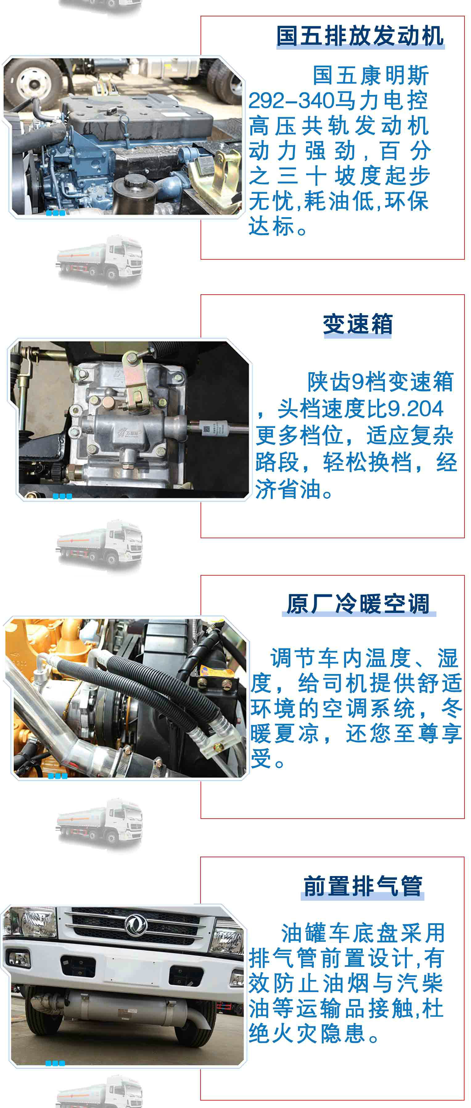 | 其他 | 該車適用于危險品運輸。運輸介質:汽油,類項號:3;罐體有效容積:28.1立方米, 罐體外形尺寸(長×長軸×短軸)(mm)為:8800×2450×1650。防護材料:Q235碳鋼,連接方式:左右側面及后下部防護均采用焊接連接,后部防護斷面尺寸(mm):120×50,后部防護離地高度(mm):490。隨底盤選裝僅高度不同的駕駛室。僅采用底盤子午線輪胎和帶ABS的底盤,該車前輪安裝盤式制動器,前置排氣管,裝配限速裝置,限速80km/h。安裝帶有衛星定位功能的行駛記錄儀。ABS生產廠家:東科克諾爾商用車制動系統(十堰)有限公司,型號:3631010-C2000。發動機型號ISL9.5-292E51A,ISL9.5-315E51A,ISL9.5-340E51A油耗值均為40.7L/100km。選裝無上走道。整車長/軸距/前懸/后懸(mm)對應關系為:11700/2050+4400+1350/1500/2400,11700/2050+4000+1350/1500/2800。危險貨物運輸車輛的類型(FL型車輛)。 | ||