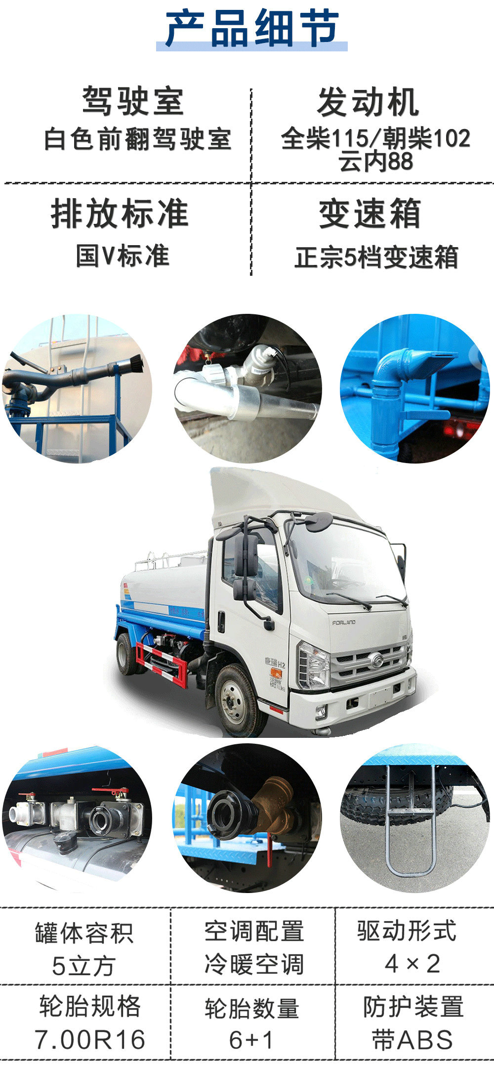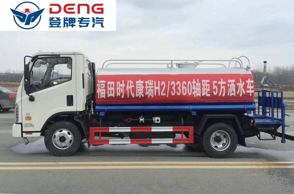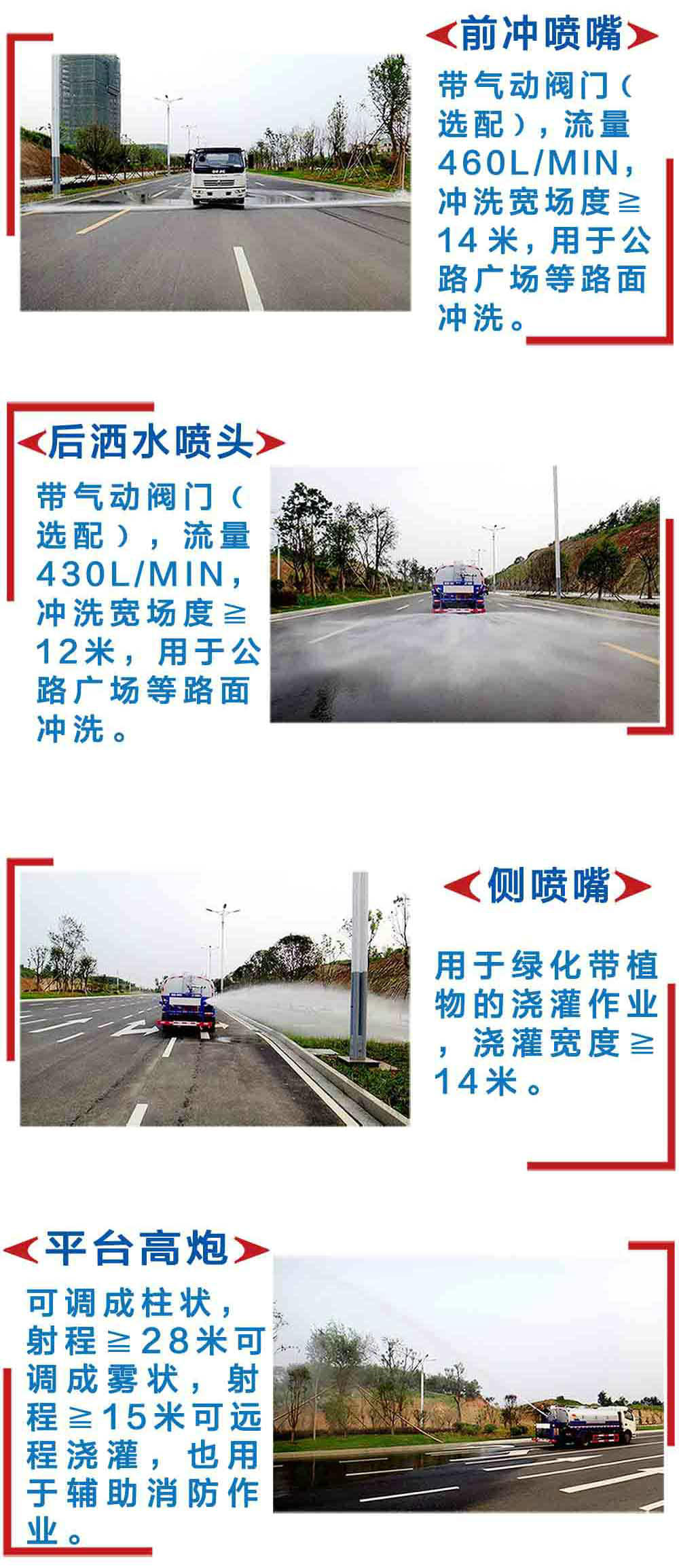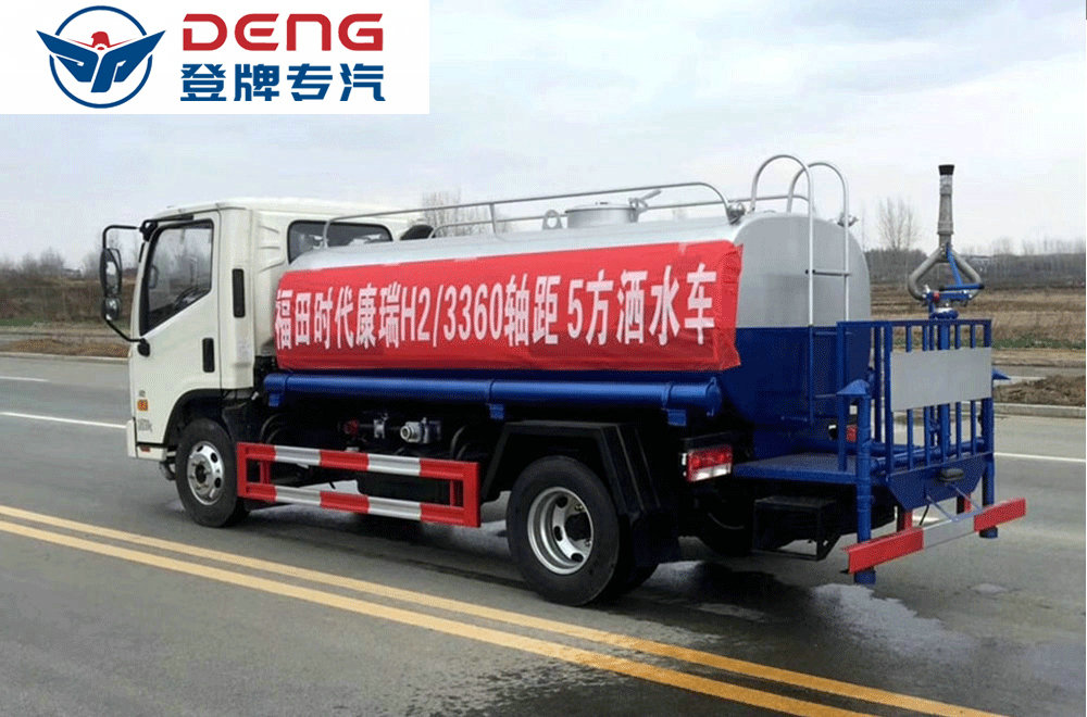 上裝配置:罐體有效容積5立方,罐體采用國標Q235碳鋼,罐體厚度3mm,自吸自排水泵,帶前沖裝置,后灑裝置,左右側噴裝置,尾部帶有安全操作平臺,帶消防接口,自流口,兩根輸水管,尾部綠化高炮,綠化高炮可調節直沖,大雨,中雨,毛毛雨霧,可以連續調節,360度旋轉;