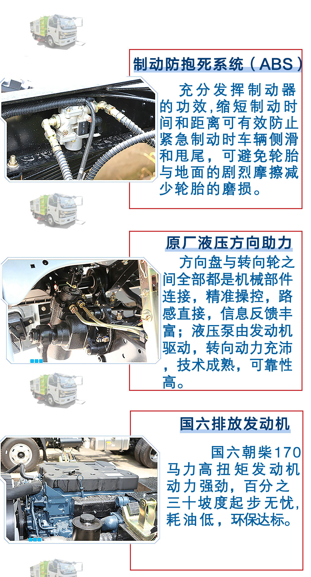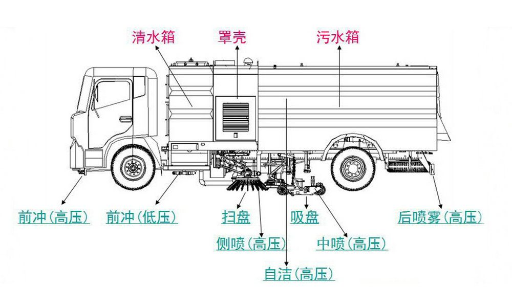 | 其他 | 此車為道路洗掃專用車輛,專用裝置為掃刷.側面防護為專用裝置掃刷代替,掃刷離地高為(mm):180,后下部防護與車架采用焊接連接,防護材料:Q235A碳鋼,后下部防護尺寸:50×120(mm),離地面高度400mm.ABS型號:ABS/ASR-24V-4S/4M,ABS型號廠家:襄陽東風隆誠機械有限責任公司.此整車長/軸距對應關系為(mm):7000/3800,7150/3950,7250/4050,7300/4100,7600/4400,6800/3600.當整備質量為7445kg時,選裝軸距為(mm):3600,3800,3950;當整備質量為7945kg,選裝軸距為(mm):4050,4100,4400. | ||