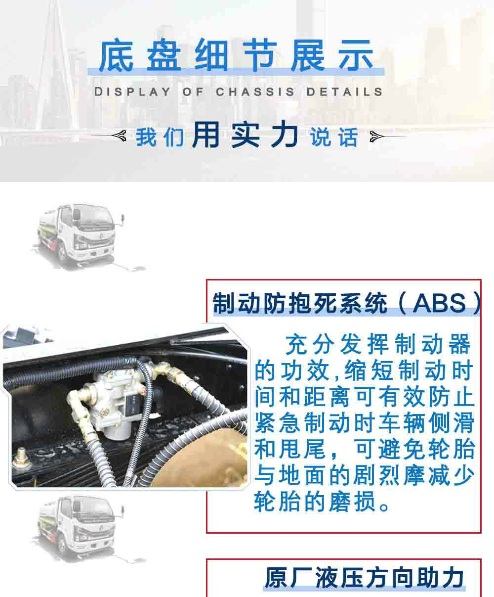 | 其他 | 1、該車僅選用3308mm軸距,罐體有效容積為4.04立方米,罐體尺寸為(mm):3400×1600×1100,3300×1600×1100。2、防護材料:Q235B碳鋼,連接方式:左右側面及后下部防護均采用焊接連接,后部防護斷面尺寸(mm):120×50,后部防護離地高度(mm):430。3、ABS型號/廠家:ABS/ASR-12V-4S/4M/襄陽東風隆誠機械有限責任公司。4、專用裝置:罐體,主要用于路面灑水及園林綠化。5、隨底盤選裝駕駛室。 | ||