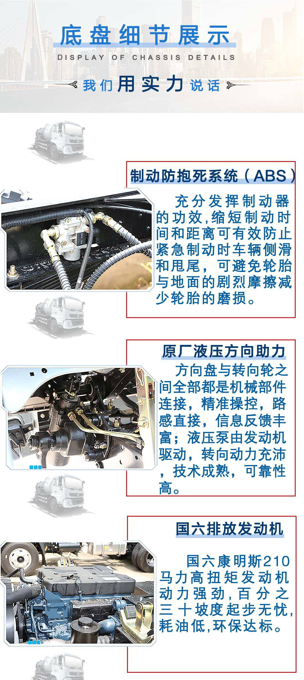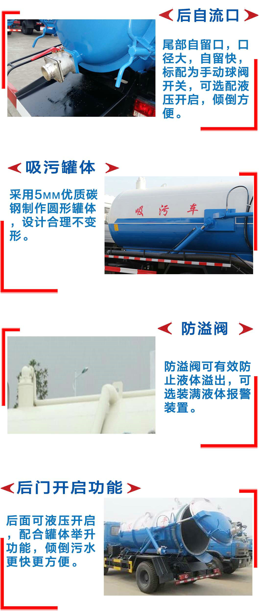 | 其他 | 該車裝有取力器,真空泵用于吸污;罐體外形尺寸(直線段長×直徑)為(mm):4100/1600;罐體有效容積:7.78立方米;防護材料:Q235A碳鋼,連接方式:左右側面及后下部防護均采用焊接連接,后部防護斷面尺寸(mm):120×50,后部防護離地高度(mm):420,車長/軸距關系為(mm):7600/3950,7500/3800;隨底盤選裝遮陽板,ABS型號及生產廠家為:3631010-C2000/東科克諾爾商用車制動系統(十堰)有限公司,J ABS/焦作博瑞克控制技術有限公司。 | ||