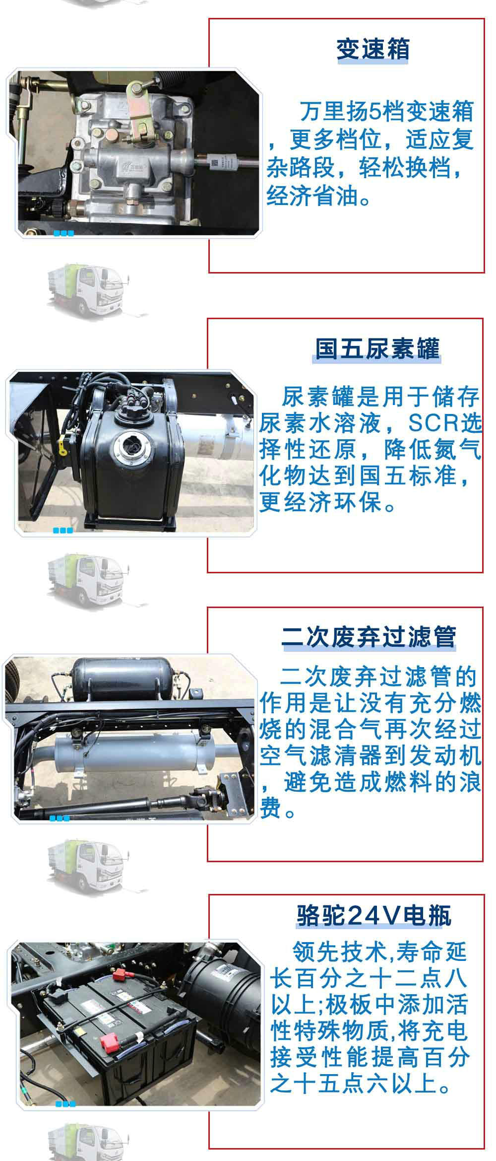 | 其他 | 1、該車主要作用于路面的機械化清掃作業;專用裝置為掃刷。2、防護材料:Q235B碳鋼,連接方式:左右側面防護裝置由專用裝置代替;后下部防護裝置與大梁螺栓連接,后部防護斷面尺寸(mm):120×50,后部防護離地高度(mm):380。3、整車長/軸距/后懸的對應關系(mm)為:6200/3308/1837,5905/2950/1900,5505/2700/1750。4、ABS型號/廠家:ABS/ASR-12V-4S/4M/襄陽東風隆誠機械有限責任公司。5、隨底盤選裝駕駛室。 | ||