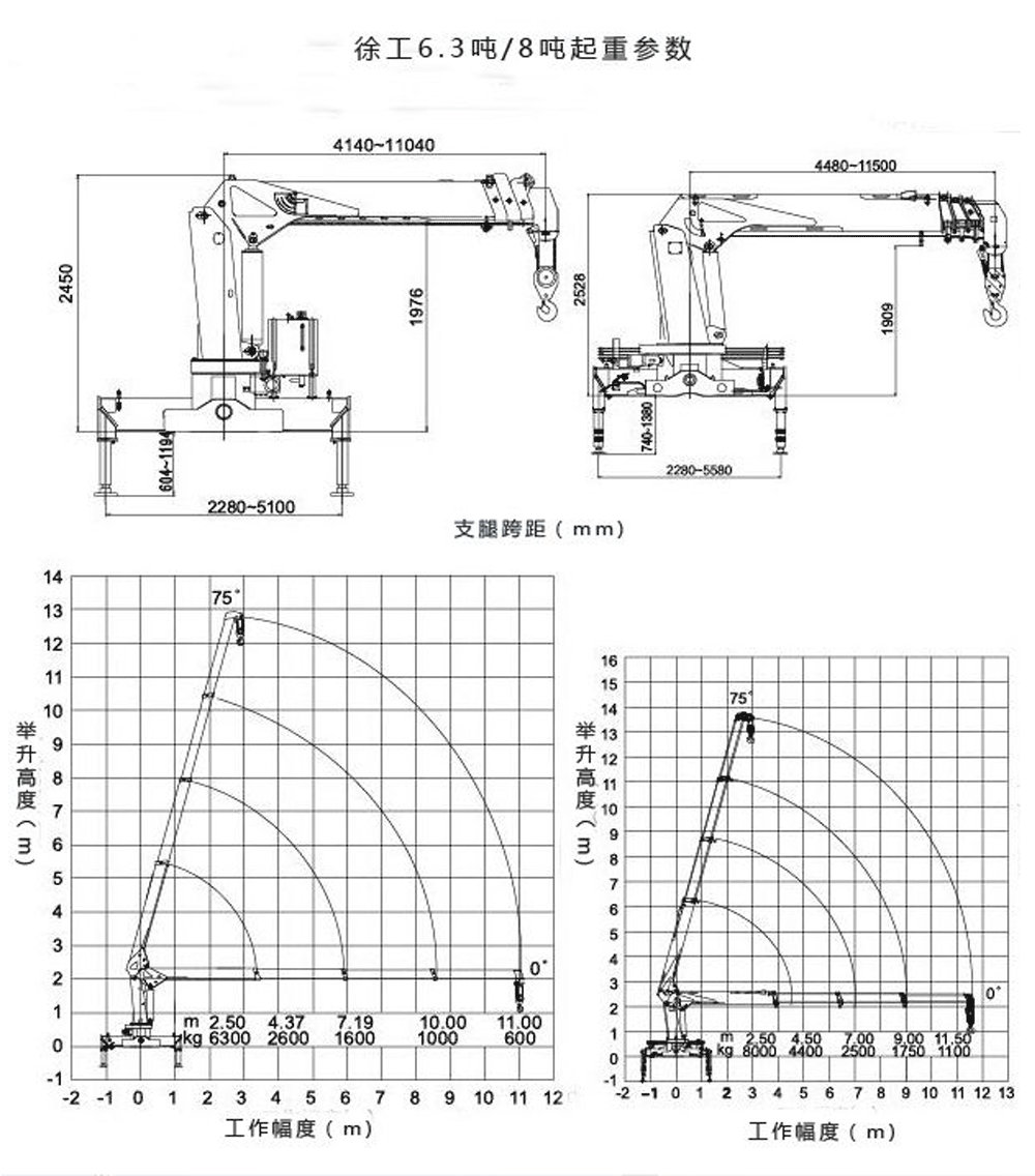 徐工8噸四節直臂吊機,不伸臂長4.48米,最大可起吊8噸,全伸工作半徑11.5米,舉升高度13.5米,不同吊臂長度最大起吊重量為:吊臂伸到11.5米起吊1.1噸,9米起吊1.75噸,7米起吊2.5噸,4.5米起吊4.4噸,2.5米起吊8噸;