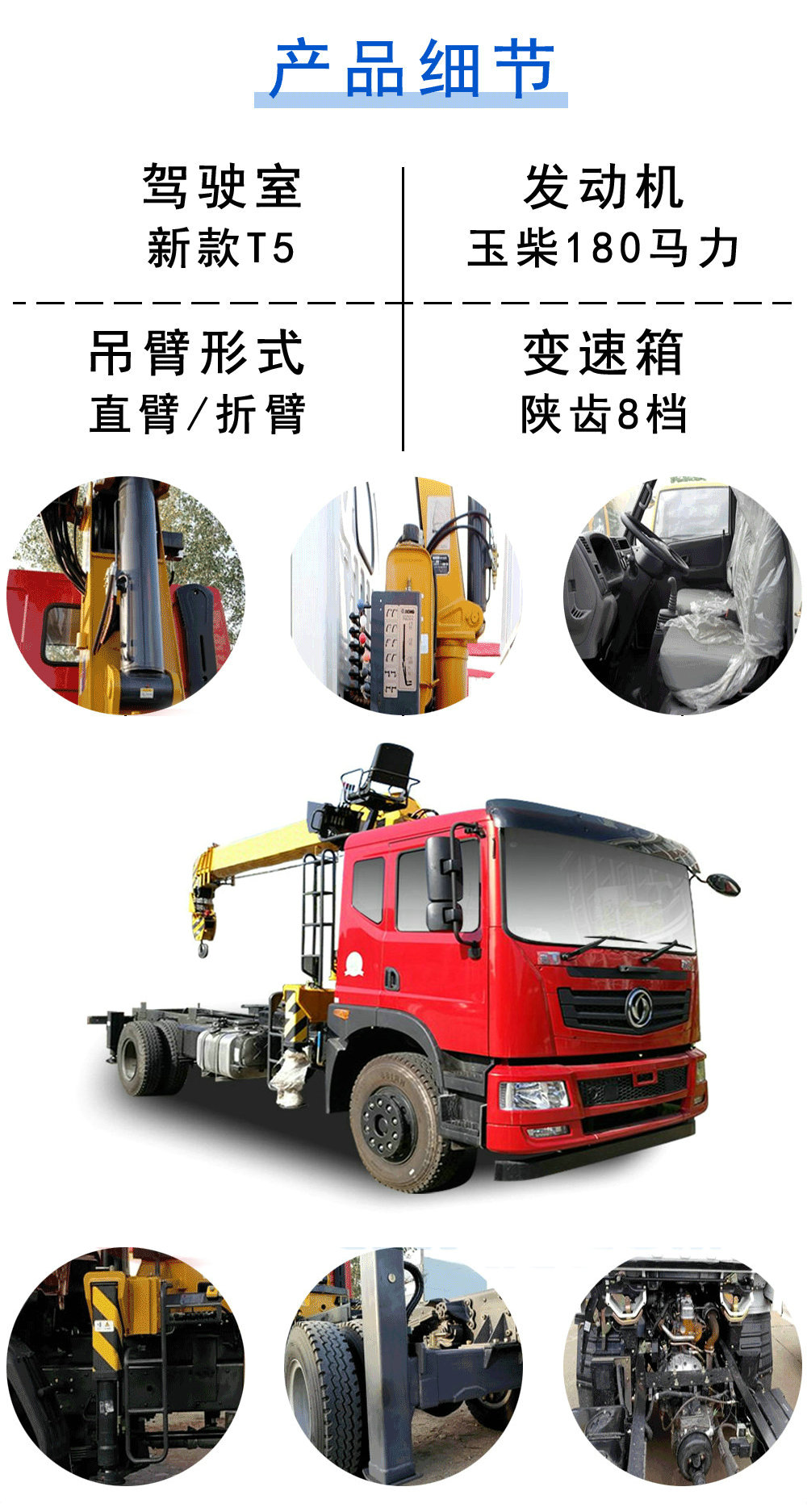 徐工8噸吊機搭配東風T5單橋隨車吊底盤,T702排半駕駛室,可選土豪金,紅色,工程黃駕駛室,玉柴6JA180-50發動機,國五排放標準,陜齒8檔變速箱,10噸后橋,300mm直通兩層局部三層大梁,帶方向助力,ABS,斷氣剎制動系統,剎車帶自動調節臂,大燈帶OBD調節功能,擋泥板帶防飛濺裝置,隨車工具在原來基礎上增加了停車楔,反光背心等,以保障運輸,剎車時的安全。