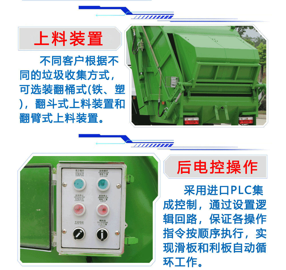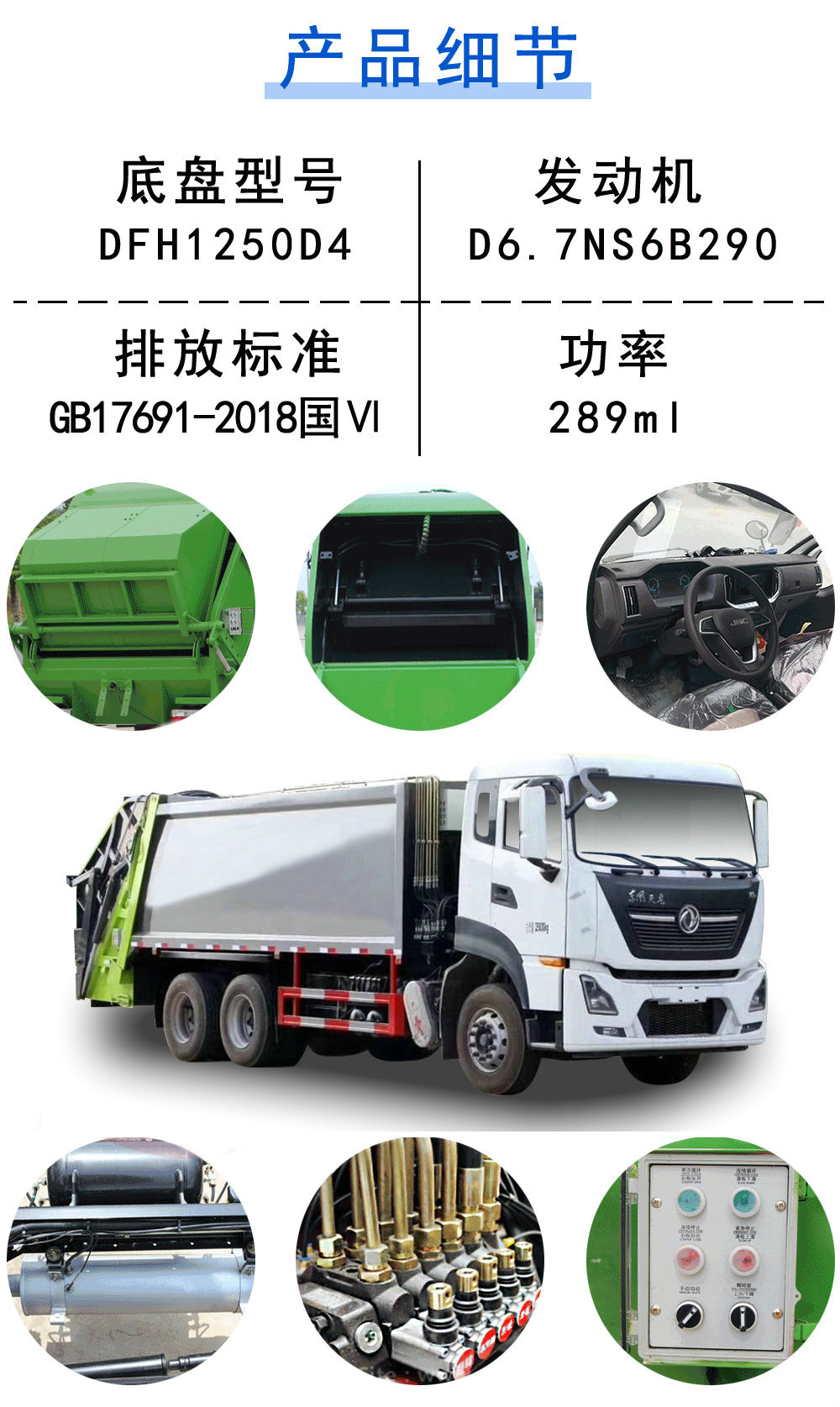 | 其他 | 隨底盤選裝駕駛室;該車可選圓弧箱體,可選6種后部配置:A(無上料裝置,基本型),B(選裝翻桶裝置),C(選裝翻蓋翻桶型裝置),D(選裝三角斗裝置),E(選裝全密封斗裝置),F(選裝擺臂裝置)對應關系為:軸距/外形長/前懸/后懸/后伸/整備質量/額定載質量對應關系為(mm):4350+1350/10100/1480(1500)/2920(2900)/0/14180/10625,10690;4350+1350/10460/1480(1500)/2920(2900)/360/14900/9905,9970;4350+1350/10280/1480(1500)/2920(2900)/180/15570/9235,9300.側防護采用Q235材質焊接連接,后部防護由專用裝置替代,后部防護離地高度(mm):500.ABS型號/生產廠家:3631010-C2000/東科克諾爾商用車制動系統(十堰)有限公司,ABS 8/東科克諾爾商用車制動系統(十堰)有限公司,4460046450/威伯科汽車控制系統(中國)有限公司.安裝具有衛星定位功能的行駛記錄儀.發動機型號/油耗值(L/100km)對應關系: D6.7NS6B290/32;DDi75E350-60/31.7,DDi75E300-60/31.7.裝備有垃圾箱液壓機構和堵塞器,將垃圾自行壓實裝入轉運的專用汽車. | ||