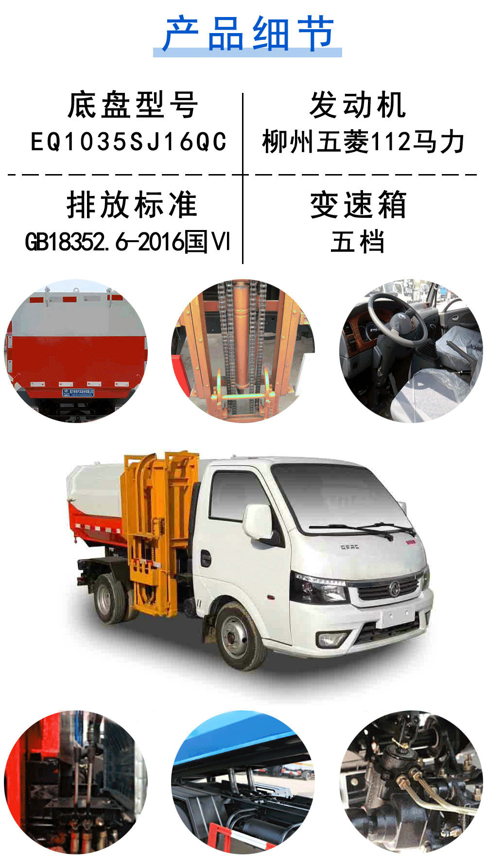 | 其他 | 1、自卸方式:后卸。僅選用2600mm和2800mm軸距,整車長/軸距的對應關系為(mm):5070/2800,4870/2600。2、發動機LJ4A15Q6,對應油耗值為(L/100km):9.1。3、ABS型號及廠家:APG3550500A,浙江亞太機電股份有限公司。4、該車裝備有掛桶提升機構及后傾卸式車廂,實現自裝卸功能,該車主要用于城市生活垃圾收集運輸。 | ||