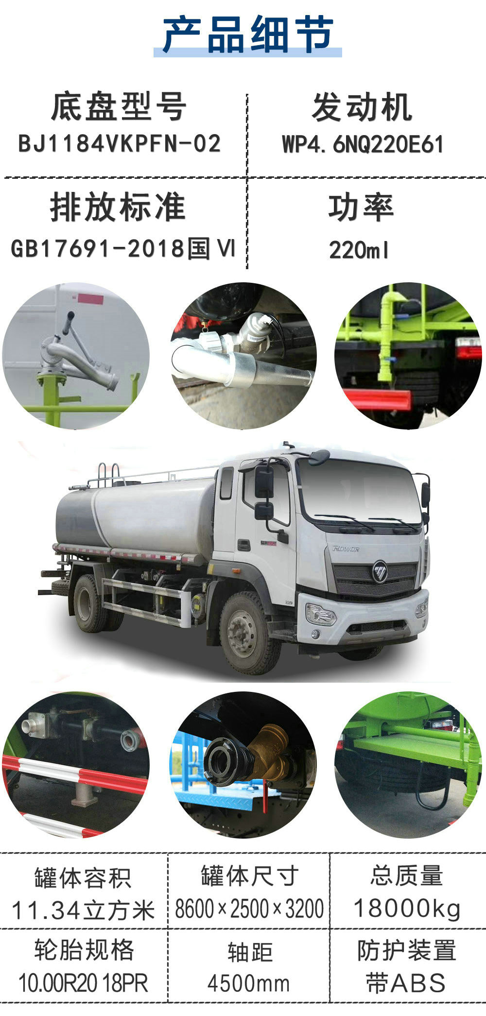 | 其他 | 隨底盤選裝駕駛室前臉樣式,擴(kuò)展后部結(jié)構(gòu)樣式,僅采用4500mm軸距,有效容積:11.34立方米,罐體外形尺寸(長×長軸×短軸)(mm)為:5200×2300×1420,5200×2300×1410;主要裝置為水罐,灑水泵,主要用于城市灑水、壓塵; ABS型號(hào)為CM4XL-4S/4M,生產(chǎn)廠家為廣州瑞立科密汽車電子股份有限公司.;側(cè)面防護(hù)裝置材料材質(zhì):Q235,連接方式:螺栓連接;后下部防護(hù)裝置材料材質(zhì):Q235,連接方式:螺栓連接,斷面尺寸(寬×高):50×120(mm),離地高度:460mm. | ||