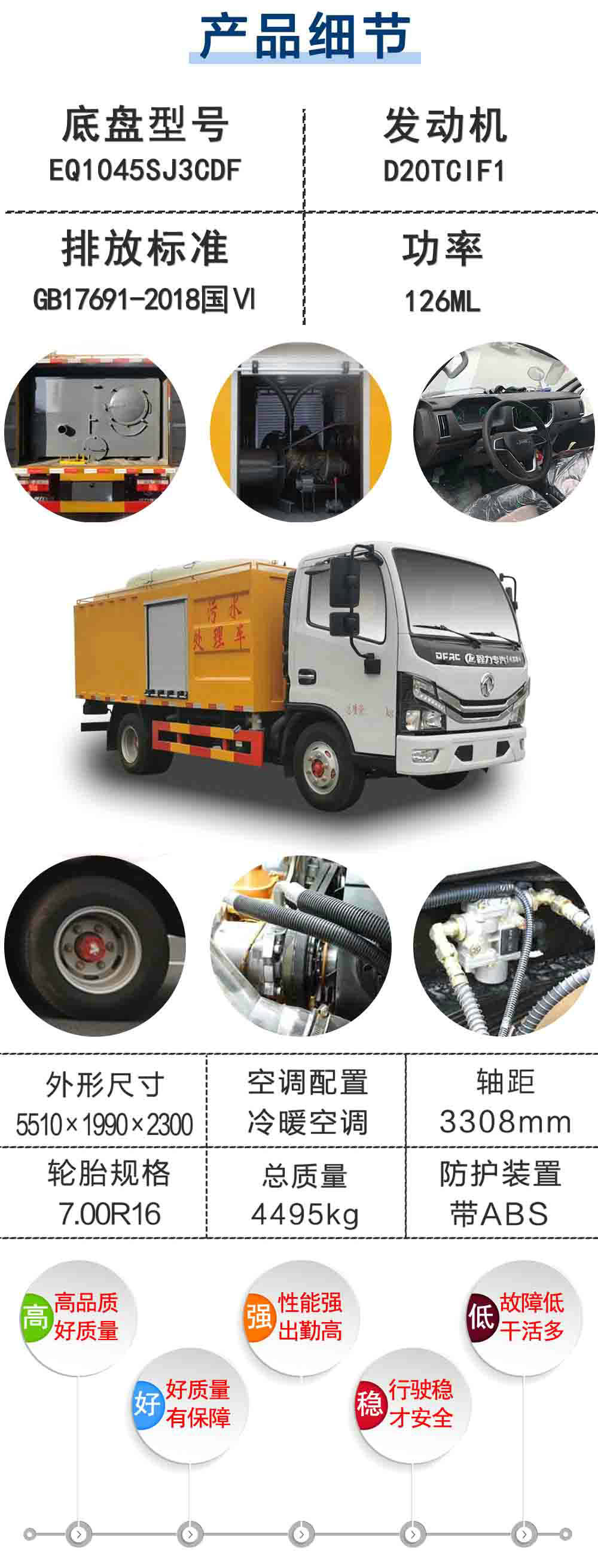 | 其他 | 該車專用裝置名稱:真空泵,高壓泵,排污泵等;防護材料:Q235A碳鋼,連接方式:左右側面均與箱體底面采用焊接連接,后部防護采用焊接連接,后防護斷面尺寸(mm):100×50,后部防護離地高度(mm):380;整車長/軸距/后懸對應關系為(mm):5995/3308/1632,5915/2950/1910,5510/2700/1755; 隨底盤選裝駕駛室,ABS型號/廠家:ABS/ASR-12V-4S/4M/襄陽東風隆誠機械有限責任公司,選裝箱體內部專用裝置,選裝新款駕駛室,選裝內部專用裝置。 | ||