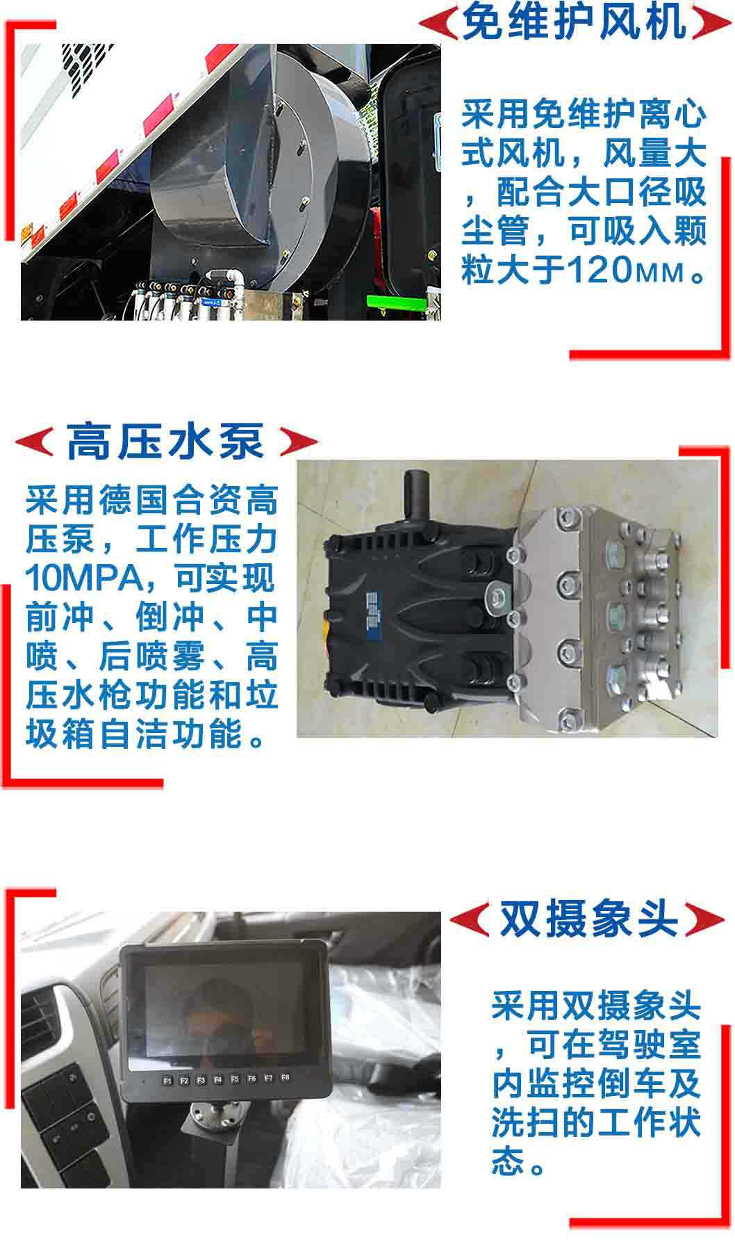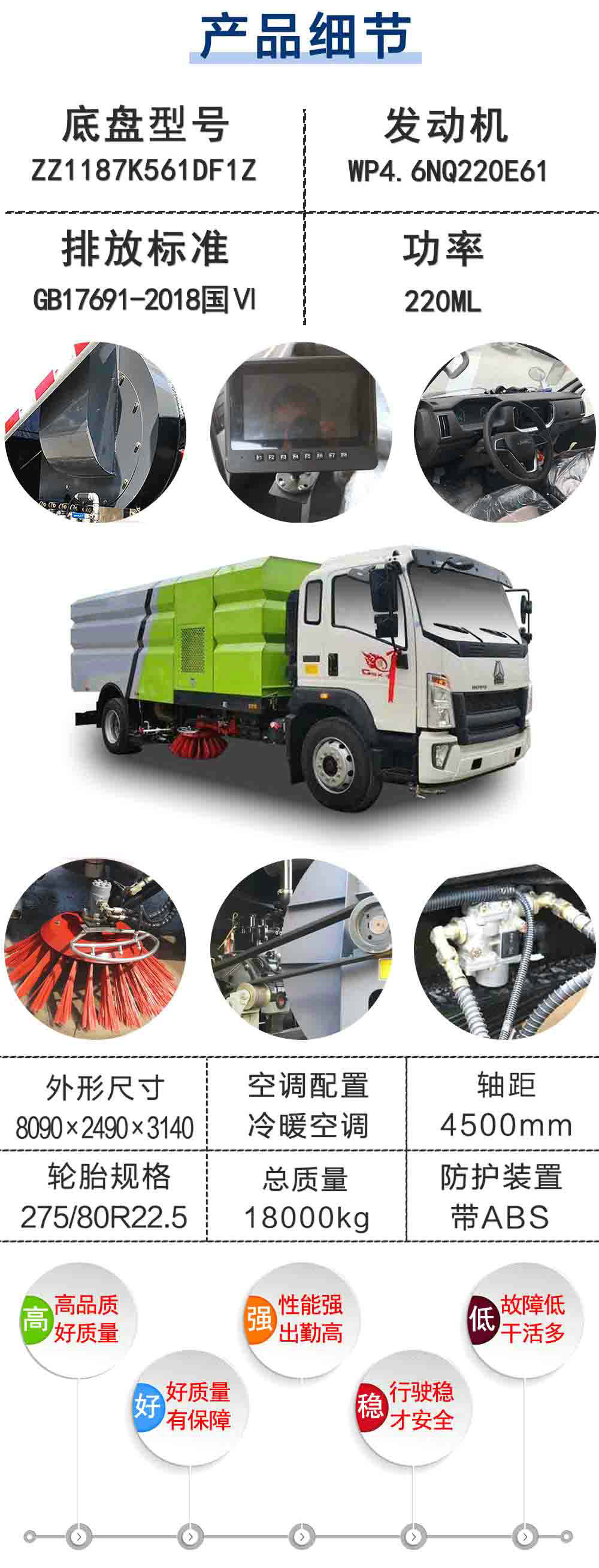 | 其他 | 此車為道路洗掃專用車輛,專用裝置為掃刷.防護裝置均采用Q235A材質,均采用焊接連接,專用裝置掃刷代替部分側面防護,掃刷離地高為(mm):180,后下部防護與車架焊接連接,后下部防護尺寸:50×150(mm),離地面高度420mm. ABS系統型號為XH-KQ4S4M-E01,生產企業為廣州市西合汽車電子裝備有限公司;型號為CM4XL-4S/4M,生產企業為廣州瑞立科密汽車電子股份有限公司.整車長/軸距對應關系為(mm):7590/4200,7890/4500,8090/4700,8590/5200,8990/5600.選裝不同的外觀圖片.隨底盤選裝駕駛室. | ||