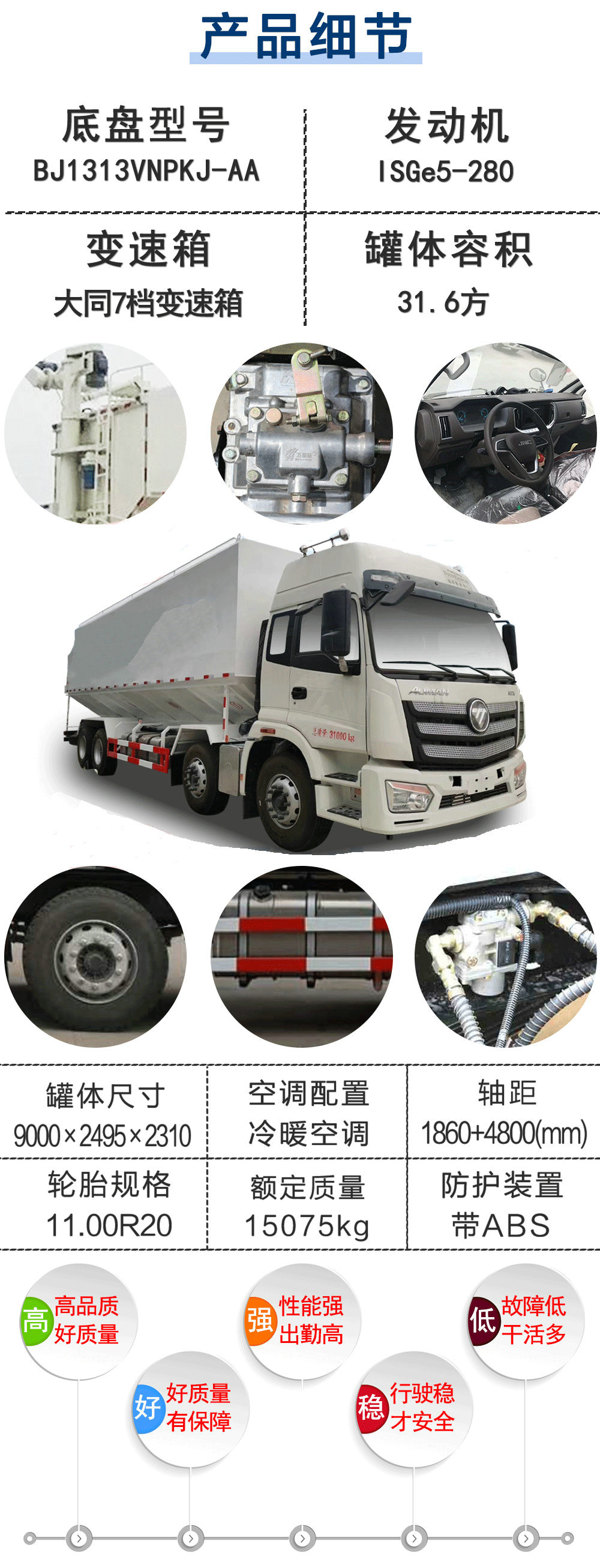 | 其他 | 罐體外形尺寸:9000×2495×2310(mm);罐體有效容積:31.6立方米;介質(zhì):膨化及顆粒飼料,粉料;密度:500公斤/立方米;長/前懸/軸距/后懸對應(yīng)關(guān)系為:12000/1555/1800+4700+1350/2595,12000/1555/1800+4725+1300/2620;12000/1555/2000+4500+1350/2595,12000/1555/2000+4525+1300/2620,12000/1530/1800+4700+1350/2620;防護(hù)材料:Q235A碳鋼,連接方式:左右側(cè)面防護(hù)采用螺栓連接,后下部防護(hù)均采用焊接連接,后部防護(hù)斷面尺寸(mm):120×50×5,后部防護(hù)離地高度(mm):520.隨底盤選裝不同的駕駛室.安裝具有衛(wèi)星定位功能的行駛記錄儀.ABS系統(tǒng)控制器型號(hào):3550X-1010,ABS生產(chǎn)企業(yè):東風(fēng)電子科技股份有限公司.發(fā)動(dòng)機(jī)型號(hào)為:ISGe5-400,SC9DF340Q5,SC9DF360Q5,ISGe5-320,對應(yīng)的油耗值為(L/100):40.81,40.75,41.4,42.72.該車專用裝置為牧農(nóng)飼料倉,自卸方式:牧農(nóng)提升自卸,隨底盤擴(kuò)展車速。 | ||