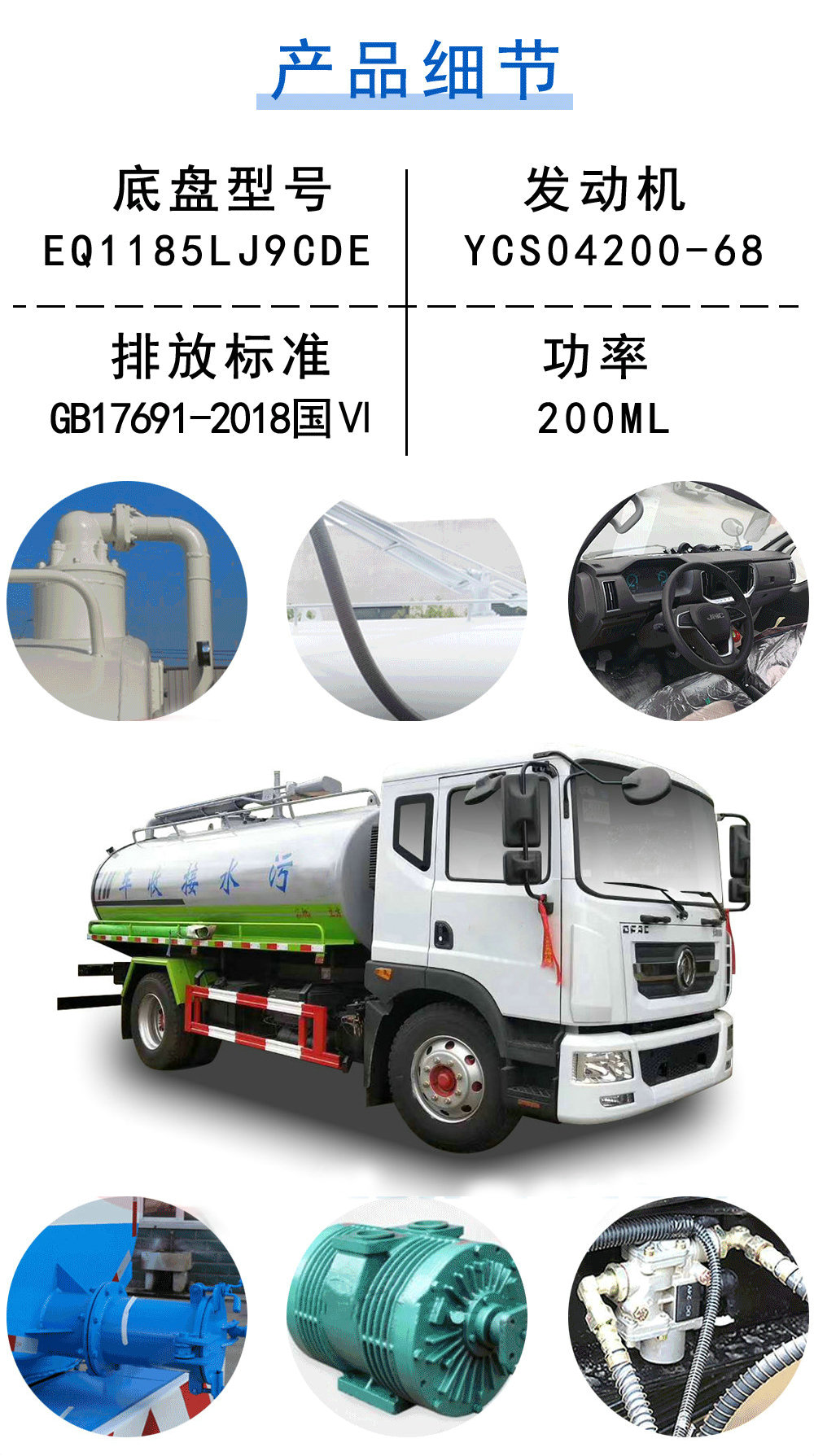 | 其他 | 1,罐體有效容積:12.8立方米,罐體外形尺寸(長×長軸×短軸)(mm):4700×2250×1550;整車長度/軸距的對應關系為(mm):8000/3950,8550/4500,8750/4700,9050/5000,9350/5300,9650/5600;2,側防護及后下部防護裝置均采用Q235A材質,側防護采用焊接連接,后下部防護采用螺栓連接,后下部防護尺寸:150×50(mm),離地面高度450mm.3,ABS系統生產廠家,型號 :焦作博瑞克控制技術有限公司,J ABS.此車為吸糞專用作業車,專用裝置為真空泵.隨底盤選裝駕駛室. | ||