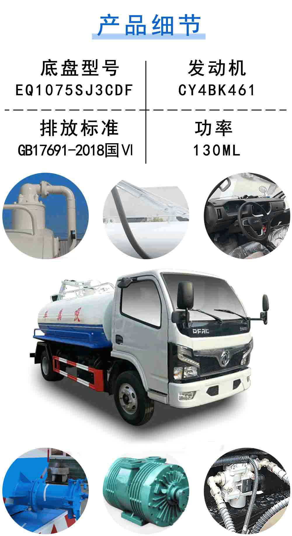 | 其他 | 1、該車僅選用3308mm軸距,罐體有效容積為4.63立方米,罐體尺寸為(mm):3500×1650×1200。2、防護材料:Q235B碳鋼,連接方式:左右側面及后下部防護均采用焊接連接,后部防護斷面尺寸(mm):120×50,后部防護離地高度(mm):430。3、ABS型號/廠家:ABS/ASR-12V-4S/4M/襄陽東風隆誠機械有限責任公司。4、專用裝置:罐體,主要用于抽排運水、糞便、油污、泥漿等各種流體。5、隨底盤選裝駕駛室。 | ||