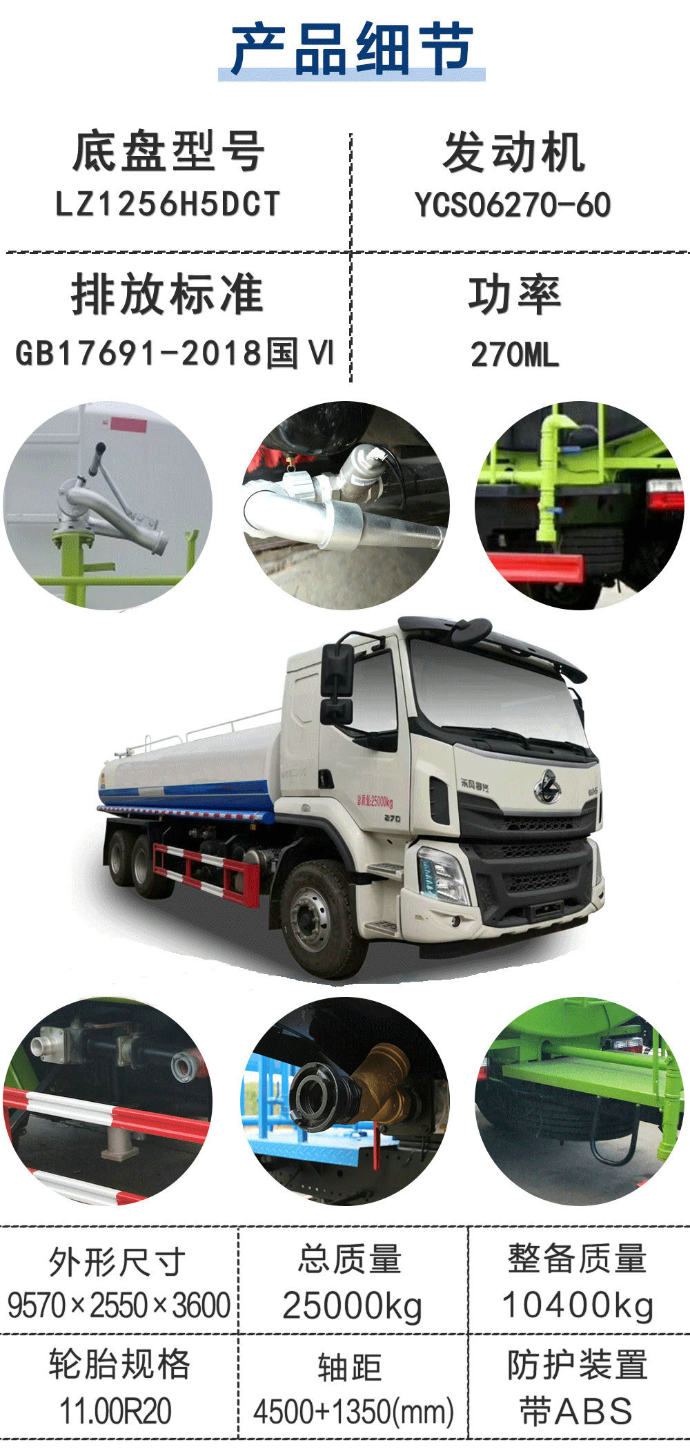 | 其他 | 罐體有效容積(立方米):15.1.罐體外形(mm): 罐體外形尺寸(6000×2350×1500)(mm);運輸介質:水,密度:1000kg/立方米.選裝保險杠、翼子板,選裝后視鏡,選裝車門下飾板,選裝臥鋪側窗,選裝綠玻璃,選裝高頂駕駛室,選裝導流罩.防護材料采用Q235A鋼板,連接方式為焊接.后防護截面尺寸120×80mm,下邊緣離地高度480mm.安裝具有衛星定位功能的行駛記錄儀.ABS型號/企業:ABS-E 4S/4M/威伯科汽車控制系統(中國)有限公司.YCS06270-60發動機對應油耗值為32.1L/100km. | ||