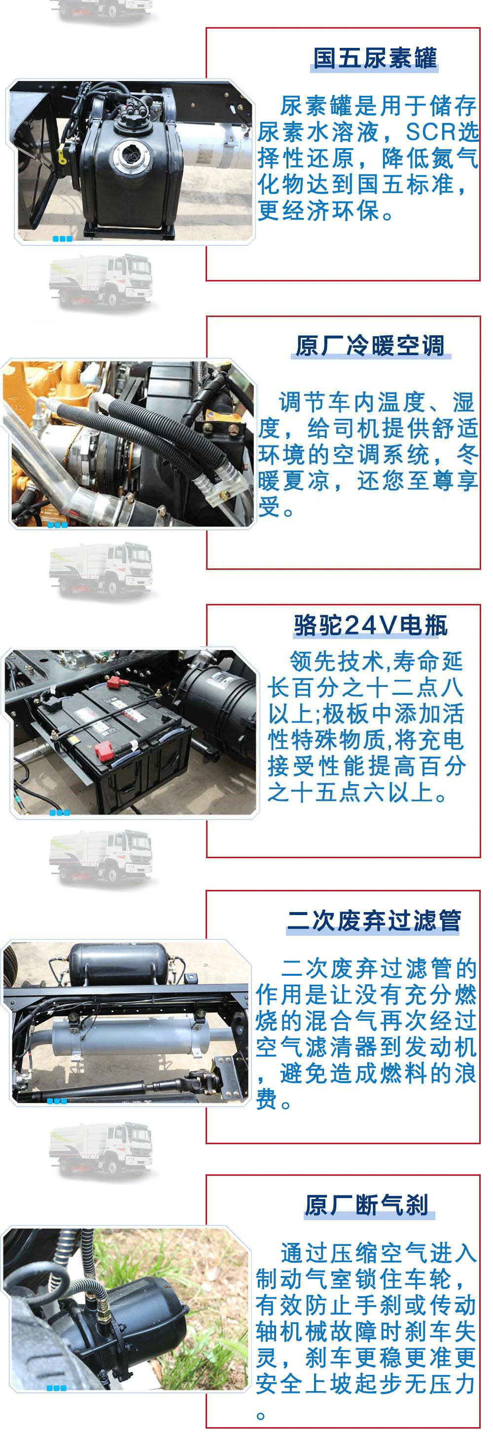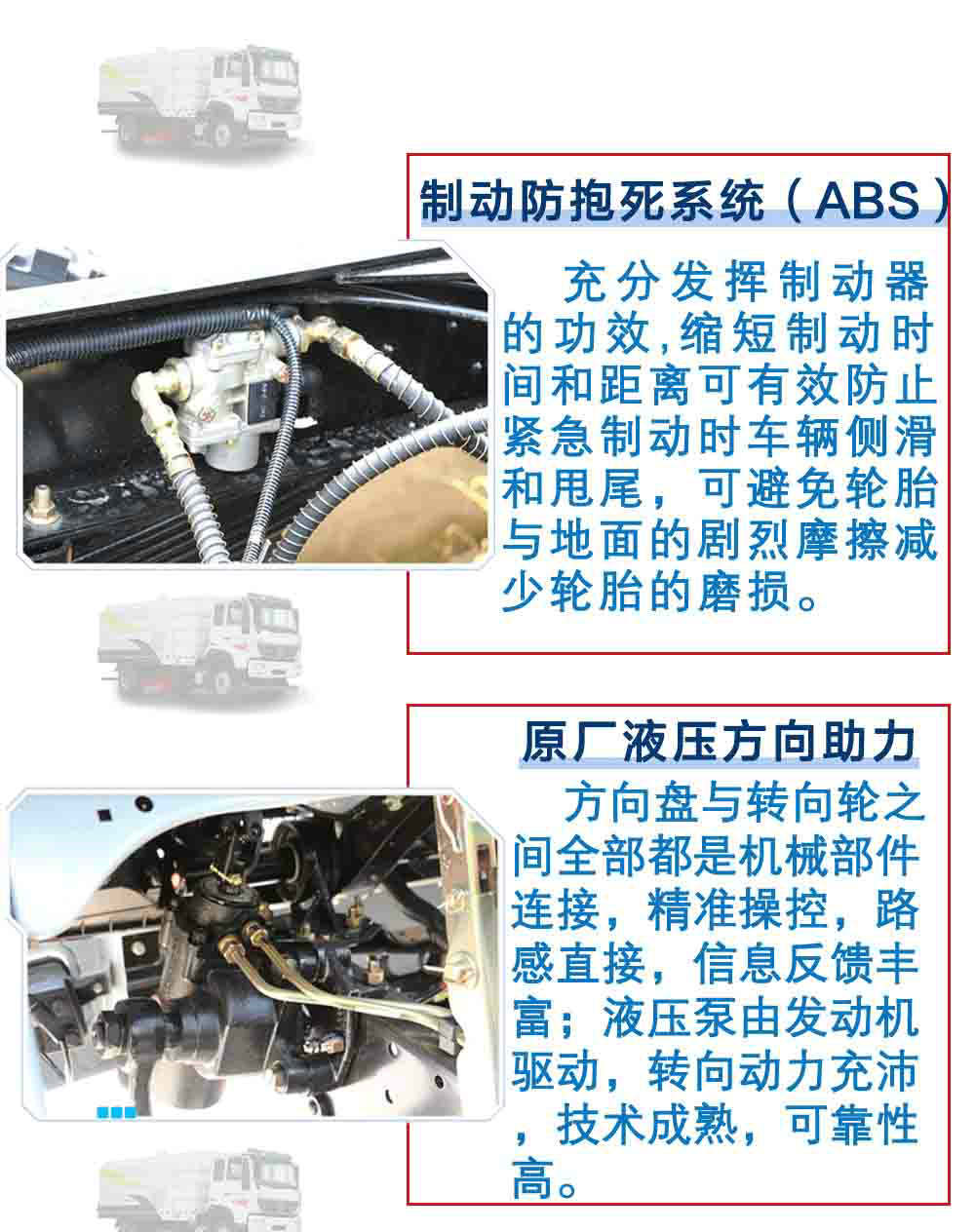 | 其他 | 1,整車長度與軸距對(duì)應(yīng)關(guān)系為(mm):7040/3800,7440/4200,7740/4500,7940/4700,8240/5000。2,防護(hù)材料:Q235A碳鋼,連接方式:左右側(cè)面防護(hù)豁免,后下部防護(hù)與副梁采用螺栓連接,后部防護(hù)斷面尺寸(mm):50×100,后部防護(hù)離地高度(mm):390。3,ABS系統(tǒng)型號(hào)為4460046300,生產(chǎn)企業(yè)為威伯科汽車控制系統(tǒng)(中國)有限公司。 | ||