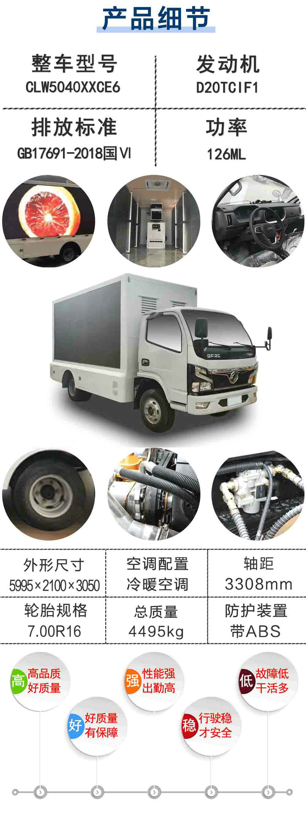 | 其他 | 該車是用于廣告宣傳的專用車輛.專用裝置為LED顯示屏.側后防護采用裙板結構代替,后部裙板離地高為490mm.ABS型號/廠家:ABS/ASR-12V-4S/4M/襄陽東風隆誠機械有限責任公司.隨底盤選裝駕駛室,兩側均可選裝:LED屏或側展,LED升降或者不帶升降屏,滾軸燈箱,條屏;選裝LED條屏,亦可選裝單開或雙開門,或者封閉;選裝尾部踏板;后部可選裝LED屏或燈箱或后展,通風口. | ||