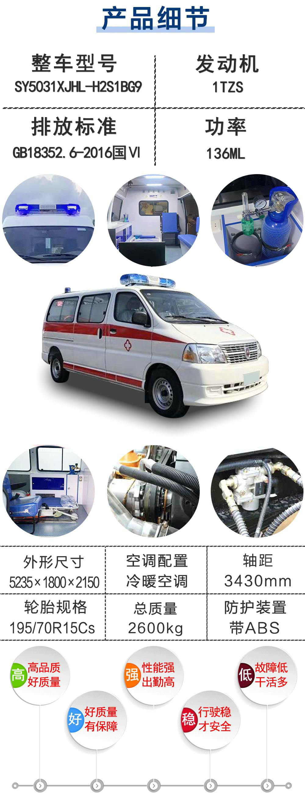 | 其他 | 選裝前部燈具,選裝后部燈具,選裝前進氣格柵,選裝外后視鏡選裝門把手,選裝后牌照燈安裝板,選裝蝸牛燈,后照地鏡,后雨刮器,倒車雷達,選裝輪轂,選裝后擾流板,選裝高位制動燈,選裝高頂(附照片)。高頂對應高度:2440mm,整備質量2030kg。選裝前散熱器格柵,前部燈具,選裝后部燈具,選裝不帶前霧燈(附照片)。該車型裝備有救護及運送傷,病員等救護相關的設備,具有運送傷員功能,提供內部照片(附照片)。VIN中LSYADACC對應單拉門、雙氣囊。發動機最大凈功率為90kW。ABS系統生產廠家為博世汽車部件(蘇州)有限公司,ABS系統的型號為2D21-3755640。 | ||
