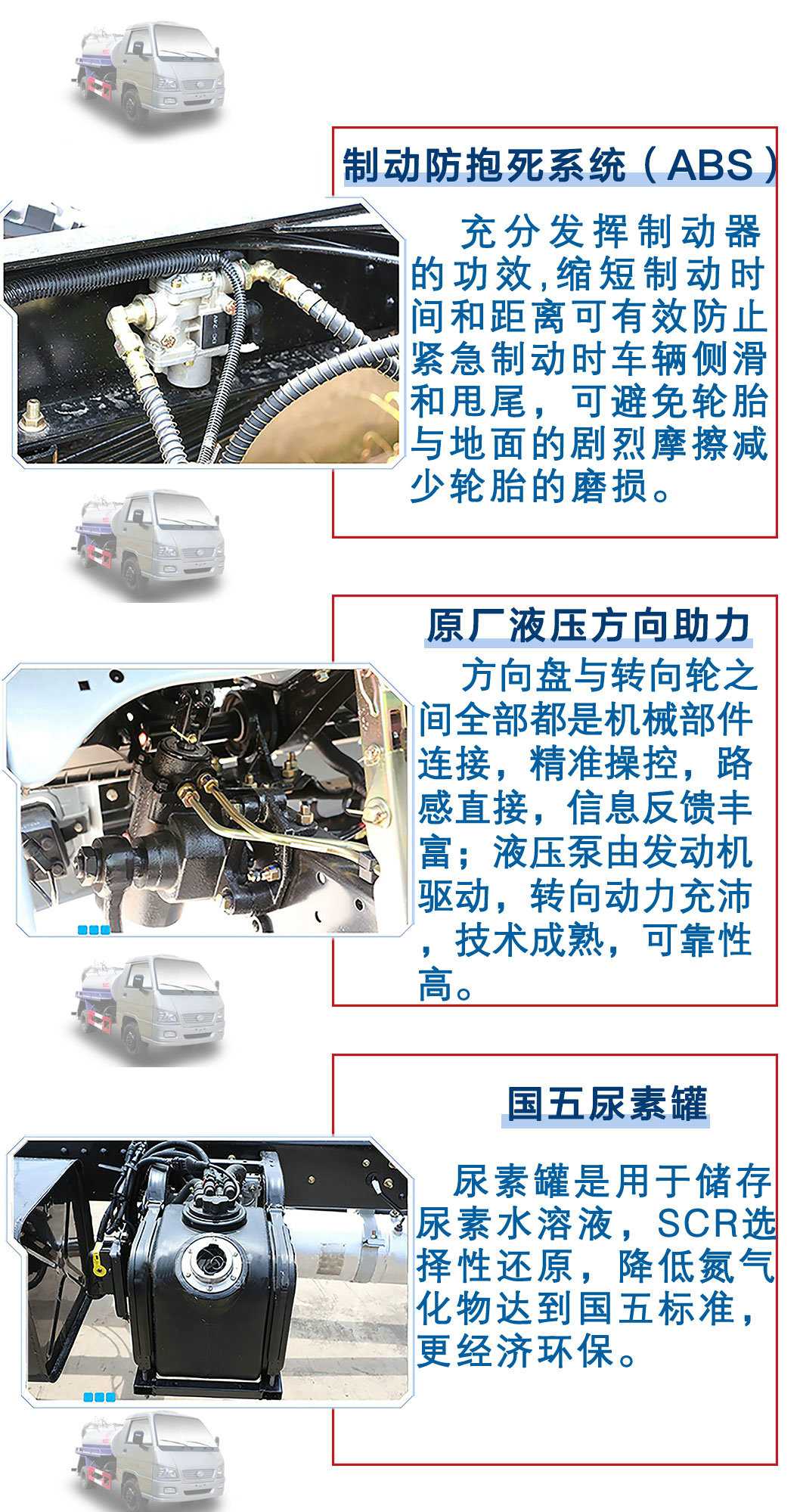 | 其他 | 1,介質:液態污物和糞便,密度:800千克/立方米,罐體有效容積:2.07立方米,罐體外形尺寸(長×長軸×短軸)(mm): 2600×1300×900。2,防護材料:Q235A,連接方式:側防護與副梁焊接連接,后防護與車架焊接連接,后部防護斷面尺寸(mm):200×50,后部防護離地高度(mm):500。3,ABS系統控制器型號:YF8,ABS系統控制器生產企業:武漢元豐汽車電控系統有限公司。4,車輛顏色,文字噴涂及局部細節可變化。 | ||