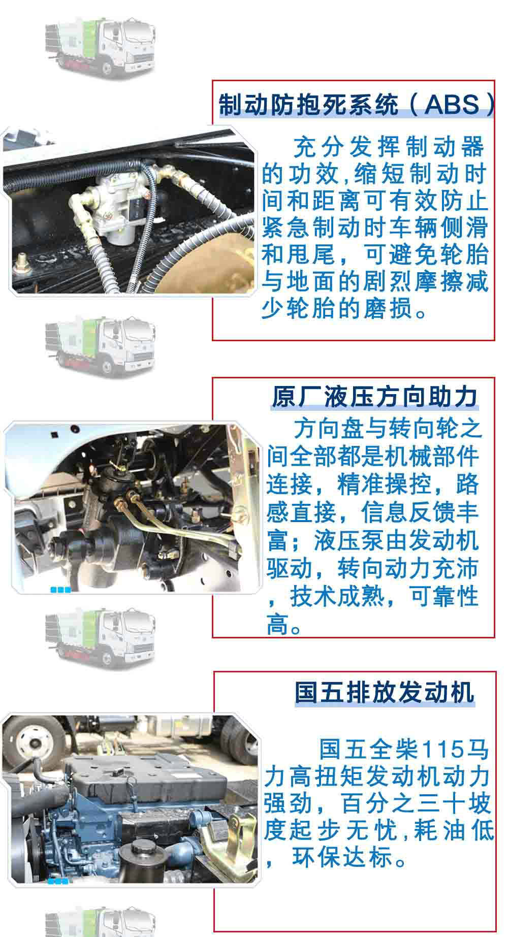 | 其他 | 隨底盤選裝駕駛室,選裝吸盤中置和單掃刷及無(wú)掃刷結(jié)構(gòu),選裝后部結(jié)構(gòu);ABS生產(chǎn)廠家/型號(hào):上海萬(wàn)捷汽車控制系統(tǒng)有限公司/VIE ABS-II;側(cè)面防護(hù)裝置與工作裝置相干涉,故豁免;后下部防護(hù)裝置材料材質(zhì):Q235A,連接方式:焊接連接,斷面尺寸(寬×高):50×120(mm),離地高度:450mm.該車主要用于城市道路清潔,主要專用裝置為水箱,掃盤。 | ||