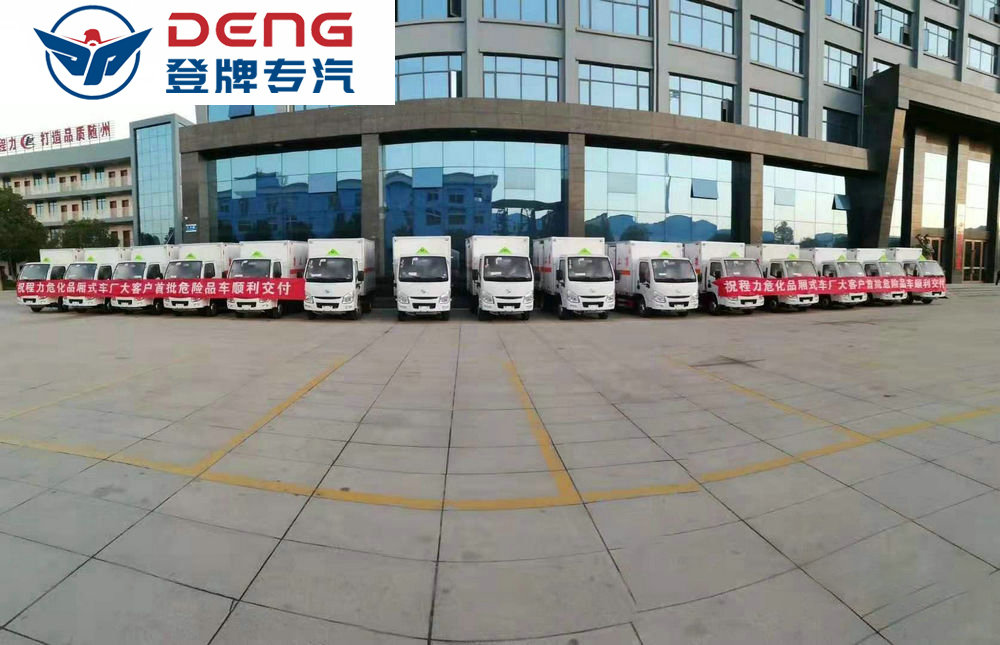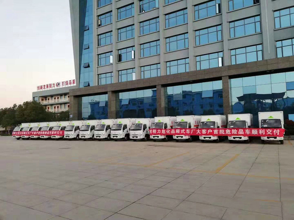 程力危險品廂式車專業廠生產的危險品車在程力老廠區8號樓前整裝待發