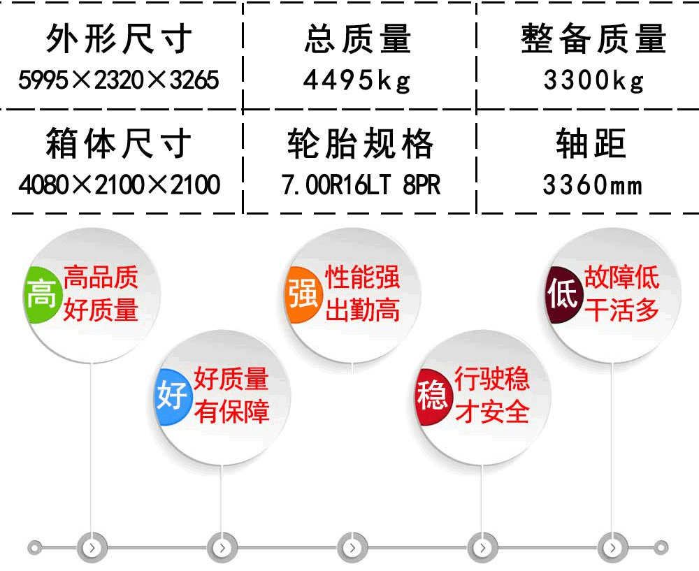 | 其他 | 1.車廂頂部封閉,不可開啟,可選裝同等功率制冷機組,選裝無制冷機組,選裝駕駛室前圍,可選裝液壓尾板,選裝液壓尾板時,液壓尾板質量350kg,收起時水平長度為280mm,選裝無側開門,選裝單/雙側開門,選裝排半駕駛室型式,選裝不同材質貨廂風格,選裝導流罩;排氣管前置,安裝子午線輪胎,安裝限速裝置,限速80km/h,安裝前輪盤式制動器,安裝具有衛星定位功能的行駛記錄儀;運輸感染性物質,類項號6.2;2.側防護材料為冷板B-2.0,選裝FRP纖維復合材料側防護,后防護材料為矩型管Q345A,均為螺栓連接.后部防護裝置截面尺寸100mm×50mm,離地高度485mm,選裝液壓尾板時,后防護材質為圓管Q345A,為螺栓連接,后部防護裝置截面尺寸直徑為120mm,離地高度400mm.3.ABS系統型號:ABS-VI.E;生產企業:廣州瑞立科密汽車電子股份有限公司.ABS系統型號:ABS-E;生產企業:威伯科汽車控制系統(中國)有限公司.4.發動機F2.8NS6B131,Q28-130E60對應的油耗值分別為11.1,11.2;轉向輪應安裝爆胎應急防護裝置. | ||