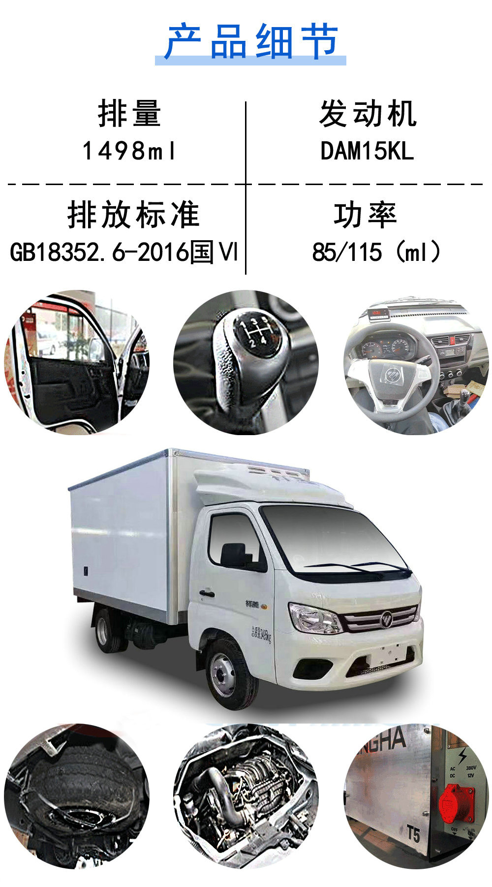 | 其他 | 貨廂頂部封閉不可開啟.ABS系統控制器型號為YF9,ABS系統控制器生產企業是武漢元豐汽車電控系統有限公司.可選裝無側開門風格貨廂,可選裝導流罩,可選裝反光膜型反光標識.選裝帶前霧燈不帶晝間行駛燈造型,選裝帶前霧燈及晝間行駛燈造型,可選裝黑色裝飾條,可選裝不帶黑色裝飾條.發動機DAM15KL,DAM16KL對應的油耗值分別為8.3L/100km,8.7L/100km,分別對應最高車速100km/h,110km/h.選裝同等功率不同造型的制冷機外觀照片.選裝高位進氣管.選裝后視鏡風格. | ||