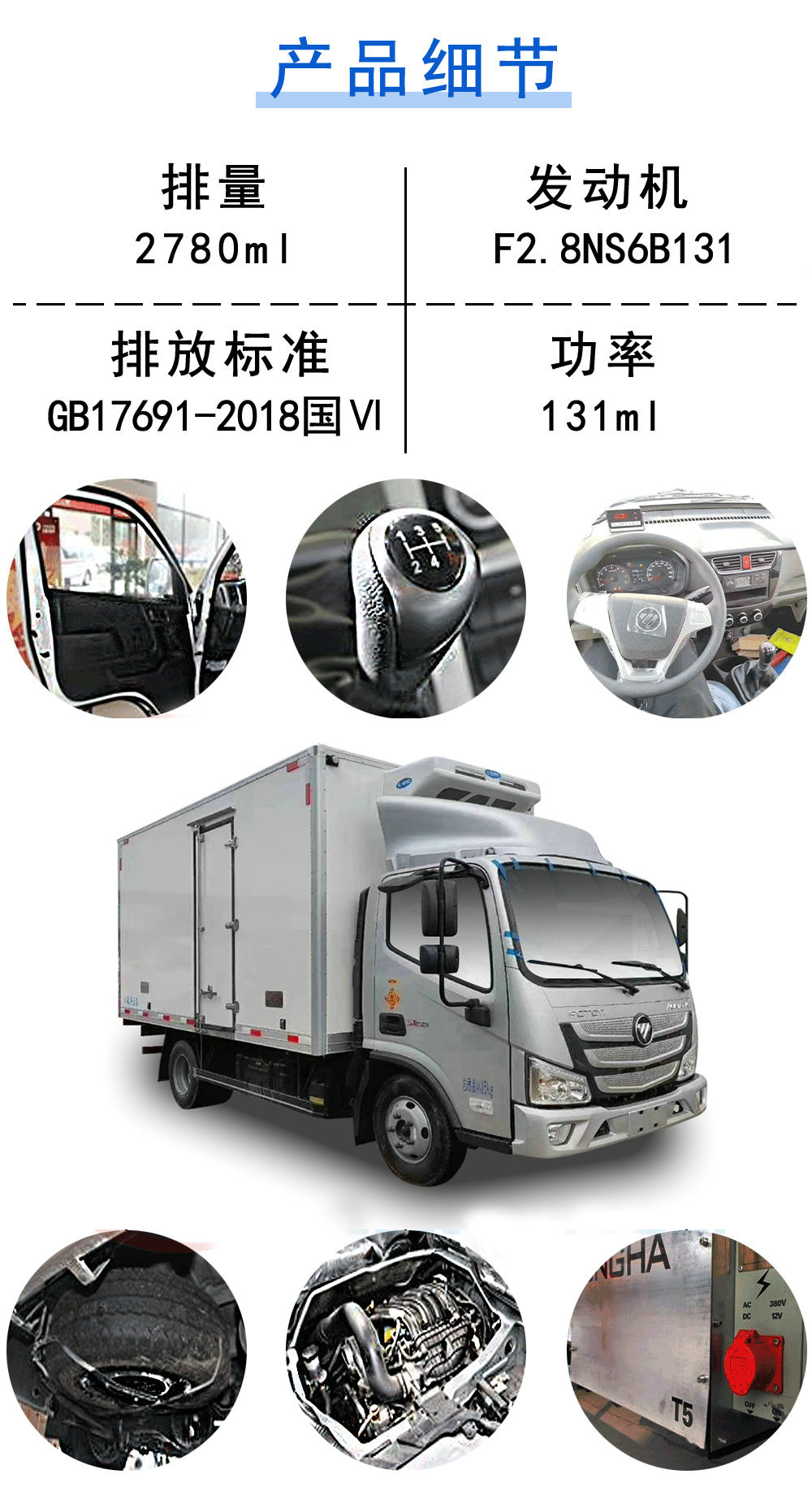 | 其他 | 1.選裝導流罩;選裝兩側單、雙、無側開門;選裝同等功率制冷機組,外觀形狀可不同.2.ABS型號及廠家對應關系:液剎:ABS系統型號:YF8;生產企業:武漢元豐汽車電控系統有限公司.氣剎:ABS系統型號:ABS-VI.E;生產企業:廣州瑞立科密汽車電子股份有限公司.3.F2.8NS6B131、F2.8NS6B156發動機最大凈功率分別為93kw、112kw.4.選裝前圍及前部燈具,前下視鏡為選裝件可不裝,選裝排半駕駛室,排半駕駛室對應貨箱內部長度為3700mm,單排駕駛室對應貨箱內部長度為4080mm.5.側防護的連接方式是與貨箱橫梁螺栓連接,側防護材料為冷板B-2.0/20,選裝材料為20號鋼的側防護、選裝鋁合金6061-T6側防護.后防護連接方式是與車架縱梁螺栓連接,后下部防護裝置材料為Q345A,選裝材料為AL6082-T6的后下部防護裝置。后部防護裝置截面尺寸100×50mm,后防護距離車輛離地高度470mm;6.發動機F2.8NS6B131、F2.8NS6B150、F2.8NS6B156對應油耗值為10.8;7.貨廂頂部封閉,不可開啟.8.準拖掛車總質量為3500kg,中置軸掛車的牽引桿深入量750mm,中置軸牽引桿連接器最大負荷350kg. | ||