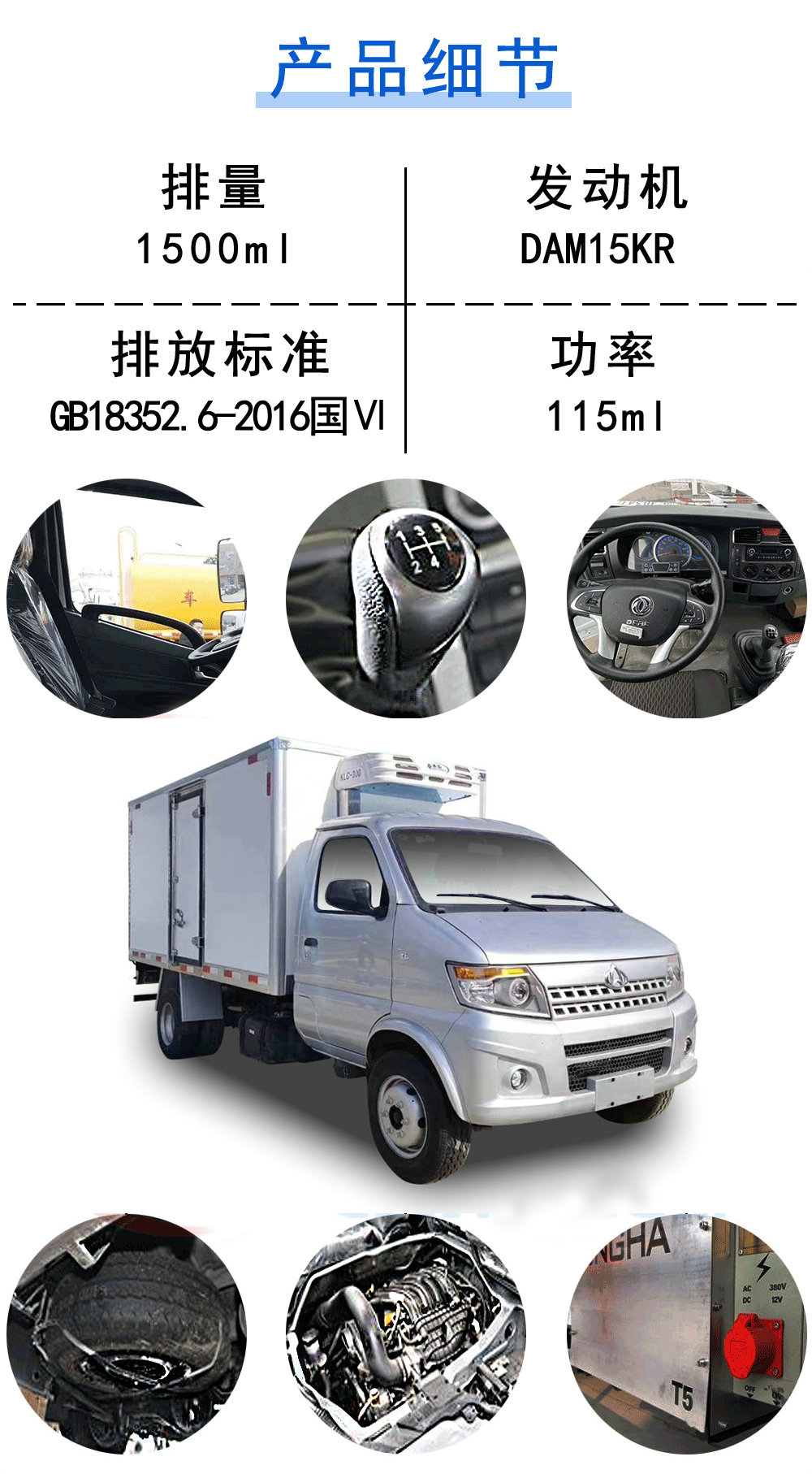 | 其他 | 選裝不同款式的前保險杠、前輪眉;選裝功率相當的其它型號制冷機組;選裝貨廂帶側門;貨廂不帶側門時整車寬度為1720(1750)mm,貨廂帶側門時整車寬度為1770(1800)mm;車廂頂部封閉,不可開啟;發動機凈功率80kW;ABS型號:WX80,生產企業:浙江萬向精工有限公司;DAM15KR型號的發動機對應的油耗值為9.1L/100km。 | ||